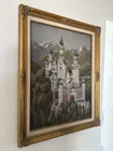 This is a rectangular wooden photo frame measuring 23 inches in width and 1.5 inches in height. The frame is gold in color with an antique floral design theme. It has a pictorial tapestry of Neuschwanstein Castle, making it suitable for all occasions. The frame can hold one photo and would be a stylish addition to home décor. Pre-owned. Frame size 29 x 23 inches.Picture size 18 x 24 inches.Pictorial tapestry unknown brand. Has been in there since day one.Sold as is see photos for details.