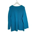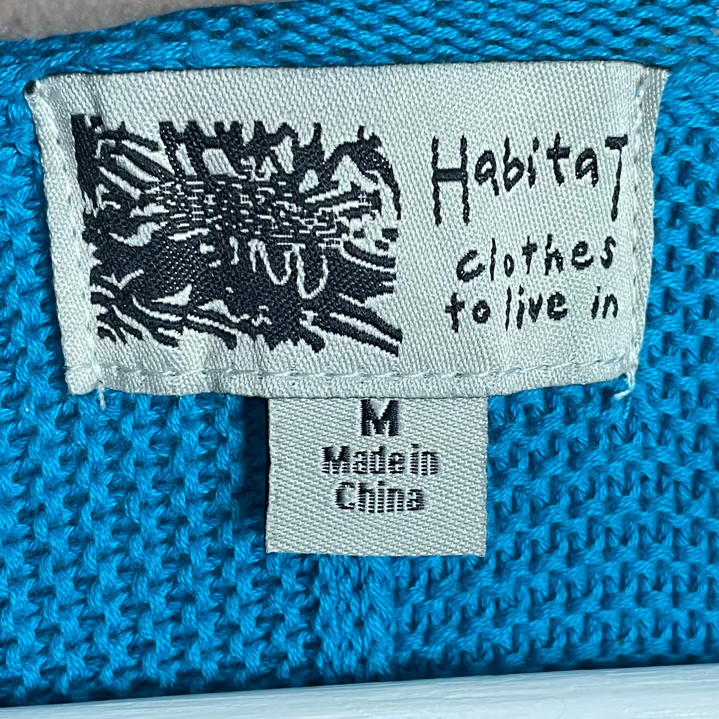 Habitat clothes to live in Turquoise Lagenlook Asymmetrical V-Neck Cotton Knit Sweater Habitat clothes to live in 100% cotton Asymmetrical hemline One pocket with buttons Long sleeves Vertical seam down front & back Rolled v-neck Size medium *approximate measurements: Pit to pit- 18.5” Length- 25” *Excellent preowned condition. Small stain on back of one cuff