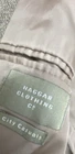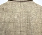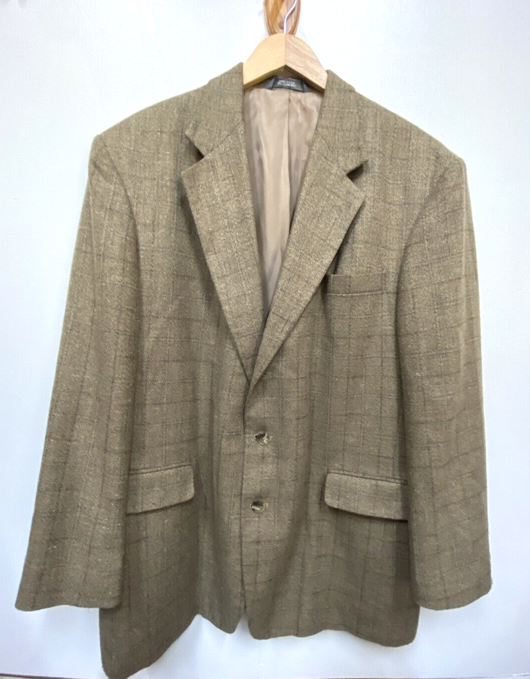 Add some classic style to your wardrobe with this Haggar Clothing Co Men's Light Brown squared tweed sportscoat. The coat features a three-button front button style and a three-button sleeve button style. It also has inner pockets for your convenience. The coat is made of high-quality tweed fabric with a silk feel lining material. The striped square pattern gives it a unique and stylish look. The coat is dry clean only and is available in size 44L. Made in USA.