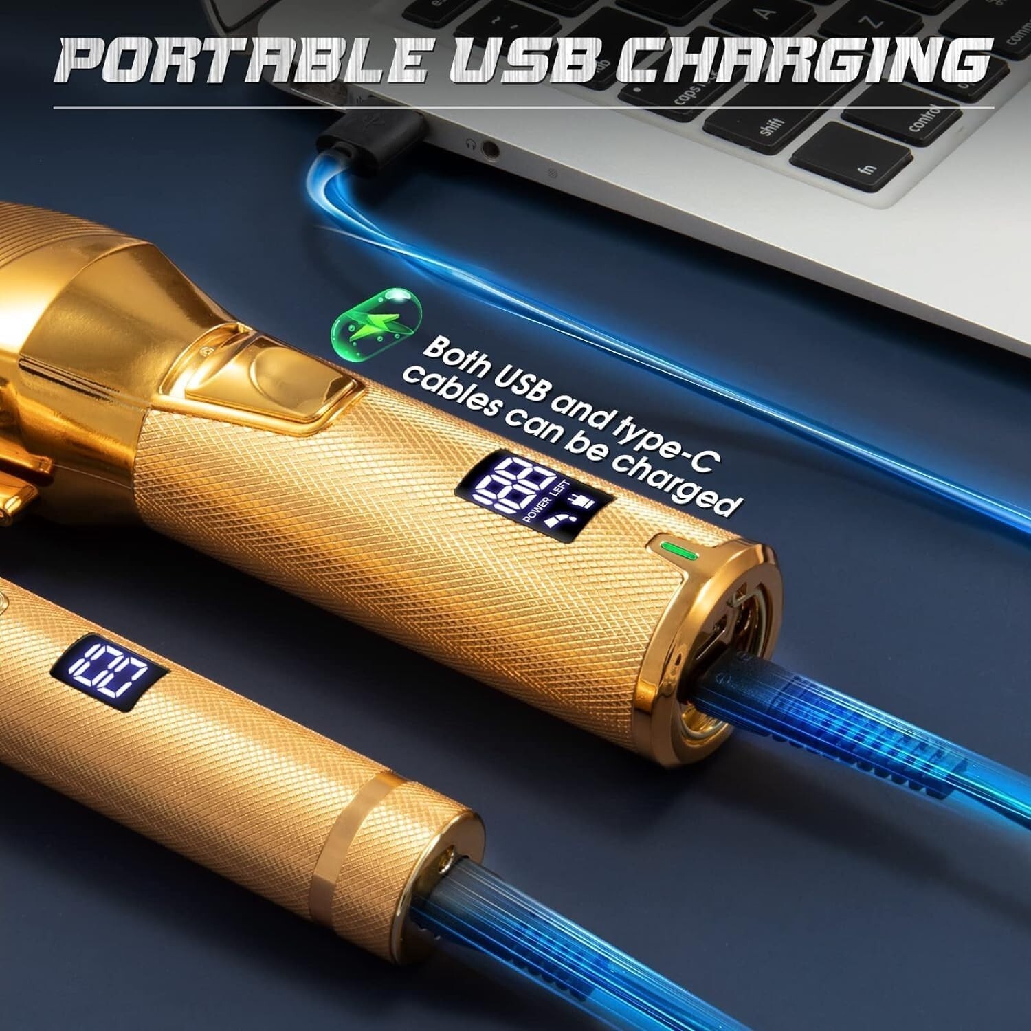 Hair Clippers for Men, Professional Hair Trimmer Barber Set Cordless Beard Trimmer Haircut Grooming Kit Gift for Men/Women/Kids/Pet (Gold) Professional Hair Clipper Set: This hair clipper set includes a professional clipper and a detail trimmer. The big one is a very fast and cool full metal body professional hair clipper for oiling, sculpting, and cutting hair! Equipped with adjustable blades, the clipper can easily cut all types and lengths of hair. Small is a very fine detail trimmer that can be used on beards, sideburns, eyebrows, and more to create the ultimate beauty. Powerful Motor and Quiet Technology: Both the clipper and the trimmer are equipped with high-performance copper core motors, making the hair clipper faster and more efficient. The large clipper is suitable for thick and wet hair, no pulling, no sticking, and a more comfortable cutting experience. Hair clippers of all sizes are equipped with the latest noise reduction technology so that the noise of the hair clipper when running is less than 55 decibels. Ultra Sharp Titanium T Blade: Professional hair clippers feature a combination of state-of-the-art alloy large blades and ultra-sharp titanium blades. When working, the cutter head is automatically sharpened, and the more you use it, the sharper it will be, and the hair will not be caught or pulled at all. The sideburn trimmer features R-shaped sharp-edged blades that are rounded and skin-friendly, protecting the scalp and skin during all-around contouring, dry shaving, and fading. Large Capacity Battery: The professional hair clipper has a built-in rechargeable 3000mAh high-quality battery that provides 300 minutes of extra-long running time in 3 hours from a full charge. The Details trimmer can run for 180 minutes without electricity after being fully charged for 1.5 hours. Both sizes of hair clippers feature a high-definition LCD power display, allowing you to know the power at any time and refuse to power off. Flexible Wireless Use: Both hair clippers support charging and plugging, making the haircut process smoother. They are equipped with 1* professional comb, 1* cleaning brush, 2* universal data cable, and 2* user manual. The large professional hair clipper is equipped with 1.5/3/4.5/6/10/13MM 6 limit combs, and the small sideburn trimmer is equipped with 1.5/3/6/9MM 4 limit combs, which can easily adjust the trimming length, even for beginners It's easy to get started.