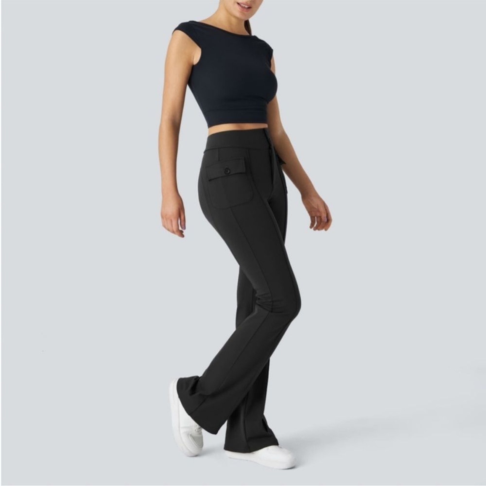 Halara Black High Waist Flare Leg Dress Pant Side Flap Pocket. NWT XL TALL 35” inseam • For: casual activities. • Features: • High waist designs that offer support & comfort, without sacrificing on style. • Who said buttons were just for function? These are designed with cute button placement. • Featuring two side flap pockets for storing your essentials such as your phone, credit cards or other small items when you're on the go. • The flared design brings retro vibes for a fun and timeless look. • Cargo pants for function and style in-one. • Four-way stretch fabric offers ease of movement and durable wearability.