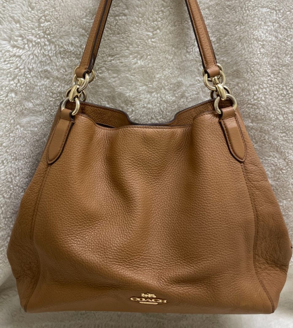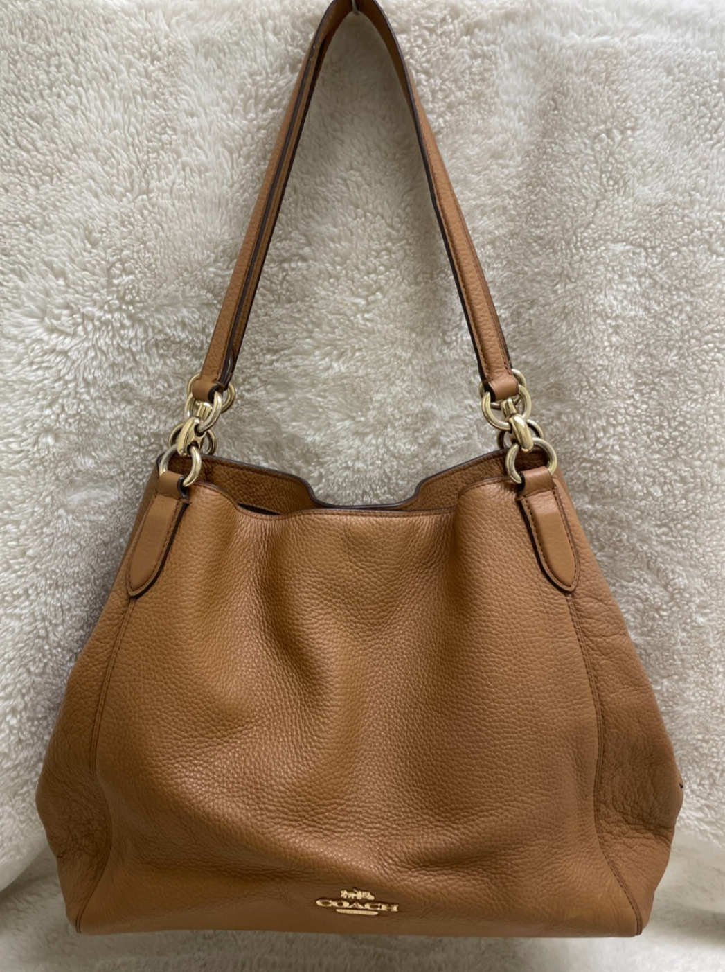Timeless, classic, Coach shoulder bag. This slouchy design is versatile, functional and a popular choice for everyday use. Pebble leather with gold, chucky accents. Very roomy, with multi-function pockets. Zipper and snap closure. CONDITION: Preowned, has a few warn spots, which are shown in the last 4 photos. You'll want to add this one to your collection. MATERIAL: Pebble Leather SIZE: Large, approximately 12.5" length, 9.5" height, 3.5" depth