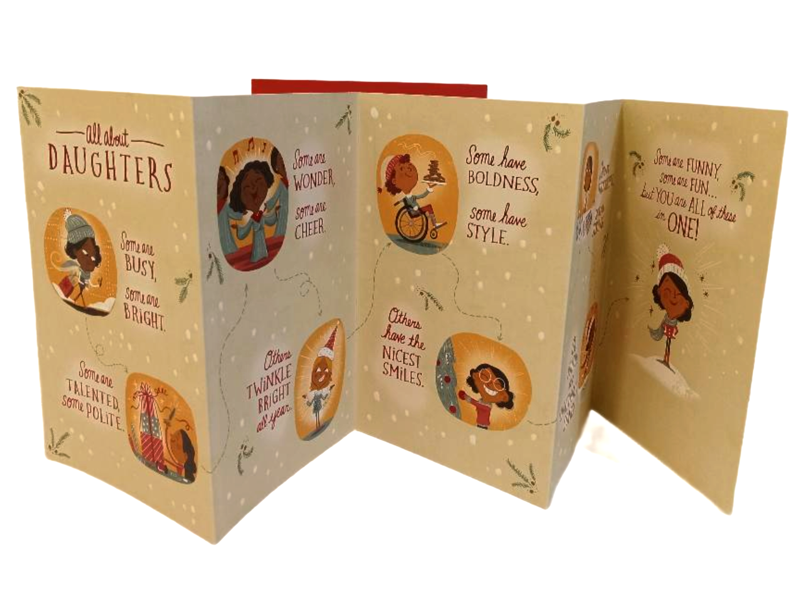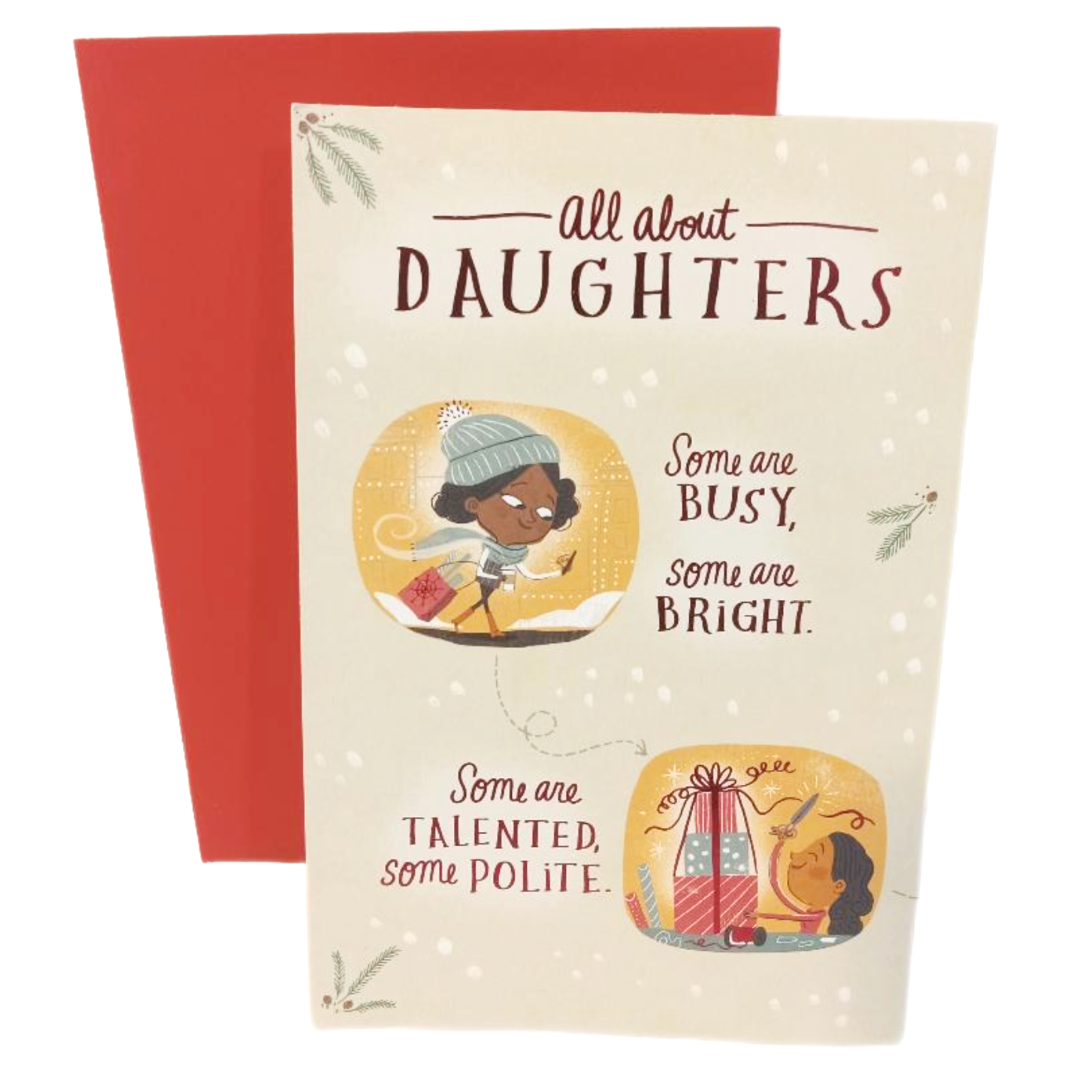 Hallmark Christmas Card Multi All About Daughters Some Are Busy Some Are Bright The Hallmark Christmas Card is a thoughtful and modern greeting card featuring a multicolor design with an all-over pattern. It is specifically tailored for daughters, with some being busy and others bright. The card includes an envelope for easy gifting during the Christmas season. Made in the United States by the trusted brand Hallmark, this folded card captures the holiday scene and is perfect for spreading Christmas cheer to loved ones. *** Item Descriptions *** Brand - Hallmark Condition - New Color - Multicolor Type - Greeting Christmas Card Theme - Christmas Holiday Scene Recipients To - Daughters UPC# - 795902502232