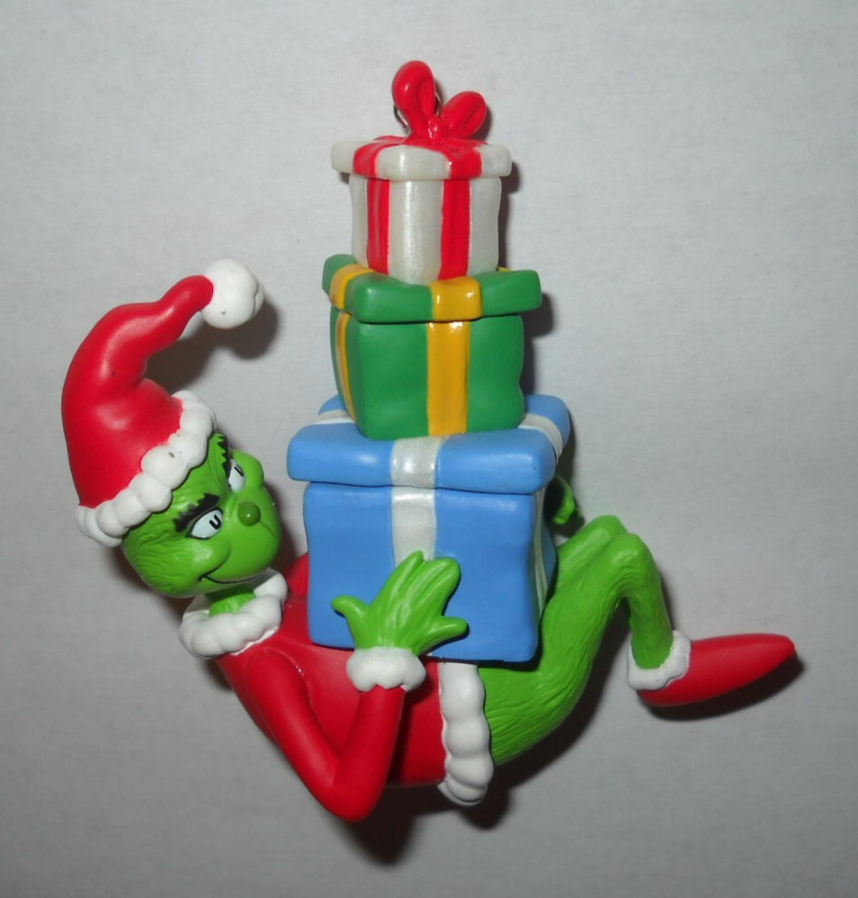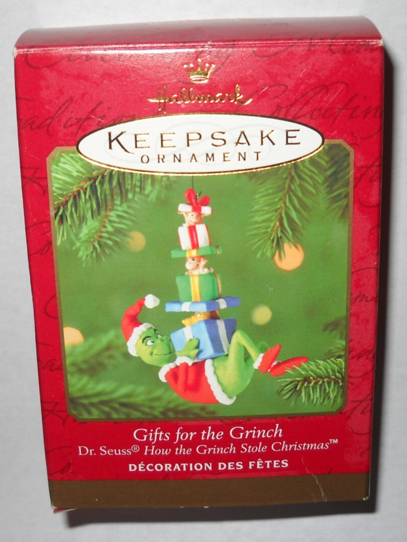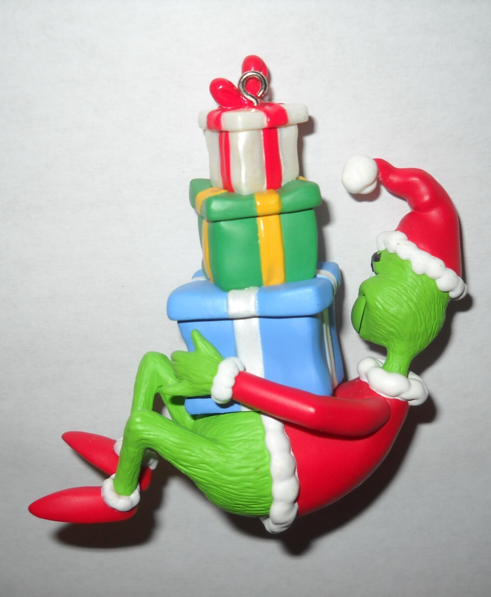 Hallmark Keepsake Ornament How The Grinch Stole Christmas 'Gifts for the Grinch' 2000 This is a cute Hallmark Ornament of The Grinch with a stack of presents! When the ornament hangs, the ornament opens to reveal Cindy Lou Who, Max the dog, and another Who inside the presents. Ornament is approx. 3 1/8"h closed and opens to 4"h. Very good condition. Original box has some wear. Smoke Free.