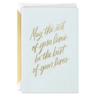Send your best wishes to newlyweds, a bride to be, or fiancés with this premium wedding card featuring foil accents and a simple sentiment. A great pairing for a gift card or present, or a beautiful standalone offering at an engagement party, wedding shower, or the big day. The Hallmark brand is widely recognized as the very best for greeting cards, gift wrap, and more. For more than 100 years, Hallmark has been helping its customers make everyday moments more beautiful and celebrations more joyful. Wish the happy couple well with a beautiful card and a sweet sentiment. Cover features gold foil lettering on a light blue background that reads: "May the rest of your lives be the best of your lives." Inside reads: "Congratulations." Perfect for including with a wedding, shower, or engagement gift, or enclosing cash or gift cards. Congratulations card measures 4" x 6" and comes with a coordinating envelope. Printed on high quality paper stock, Hallmark's greeting cards are made with paper from well-managed forests. Hallmark Signature greeting cards assortment offers stylish shoppers a curated and considered line of upscale and unique cards and gifts that reflect their personal style and make an immediate and lasting impression.