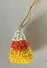 Two-inch high by 1 1/2-inch wide orange, yellow, & white felt handmade candy corn Halloween ornament with gold-colored metallic hanging cord. Decorated with sequins and seed beads. Smoke-free home. Original design.