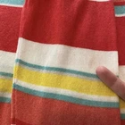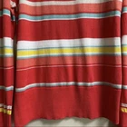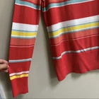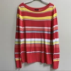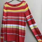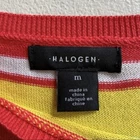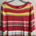 Colorful, striped knit top from Halogen. Lightweight sweater fabrication. Ribbed boat neck. Ribbed hem and cuffs. Pictures show more of a red color, but it is actually a watermelon and coral color with aqua, yellow, and white stripes. Size Medium Measures Flat Approx: 19” Pit to Pit, 26” Long 75% Pima Cotton / 25% Viscose Machine Washable **This sweater is preowned, and shows light wear! No holes or pulls! One light mark on the back of the right arm! Great Condition!**