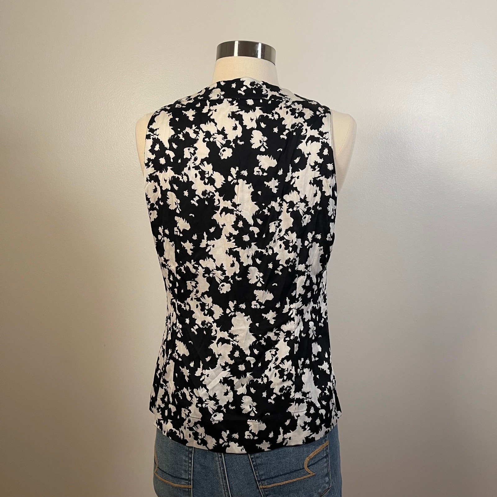 Brand: Halogen Features: Black and white flower printed silk blend sleeveless blouse, layered flower trim at neckline, hidden side zipper closure Fabric: 93% Silk/7% Spandex Size Small Good pre-owned condition, wear on zipper pull (see all photos) Approximate Flat Measurements: Bust - 18" Length - 24" • Smoke free, pet friendly home • Ships next day or sooner • Price negotiable, send me an offer! A28-AII