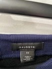 This Halogen skirt is a size XS in a solid blue color with a front side button design and back split. It is made of a Rayon Nylon Spandex fabric blend, tailored in a straight & pencil style. The skirt is below the knee in length and perfect for a fashionable and professional look.