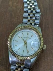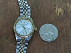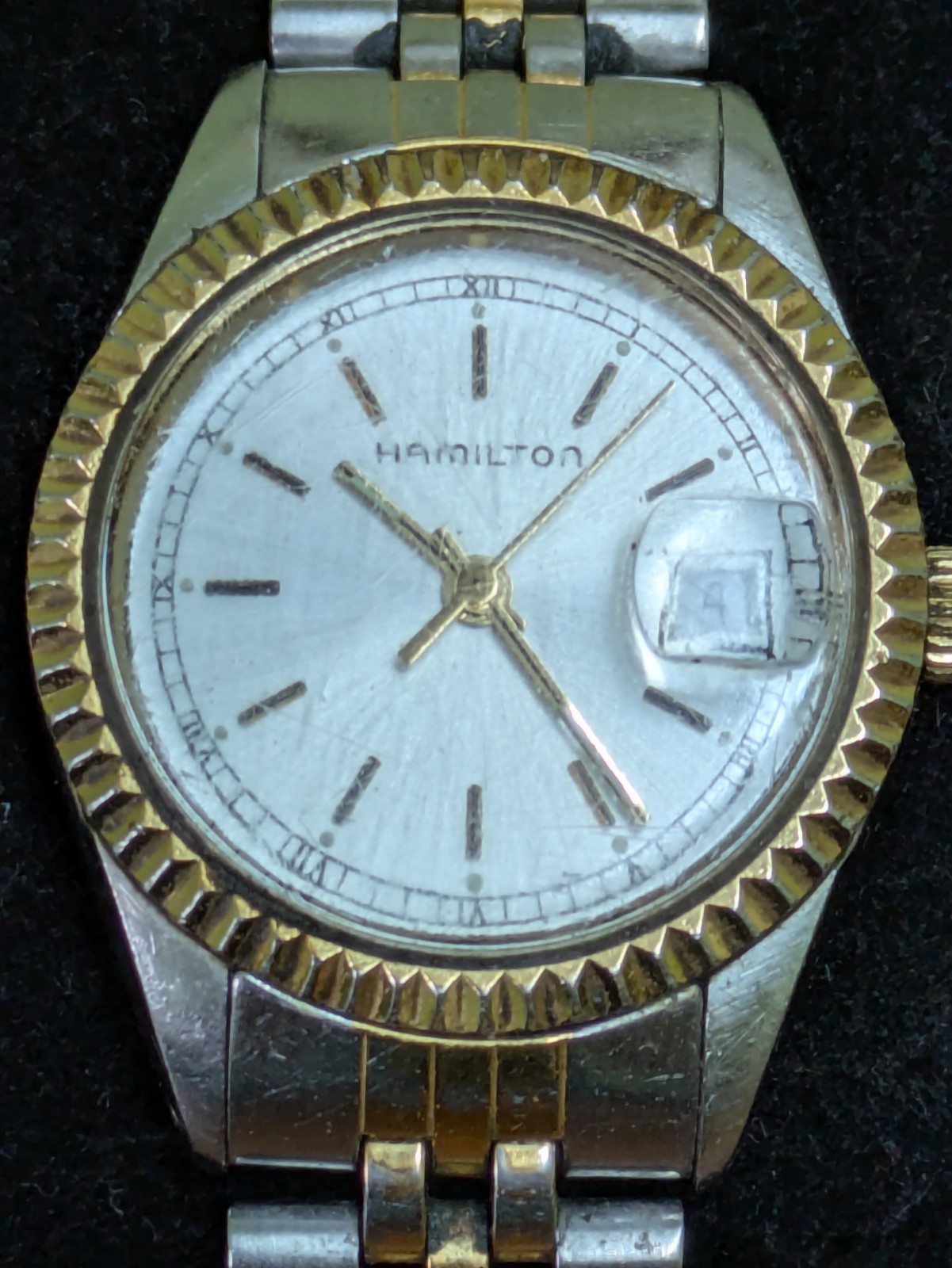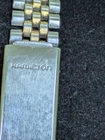 This vintage Hamilton Lady Hamilton wristwatch features a beautiful gold and silver tone stainless steel bracelet and a 25mm silver tone case. The classic quartz movement keeps time accurately. There's a lot to like about this watch but it does have a couple of issues consistent with age and use. First of all, the crystal has some scratches. It looks acceptable from a distance but the scratches are really visible up close. Also the gold tone on the band has wear. Please see pictures for the cosmetic condition and dimensions.