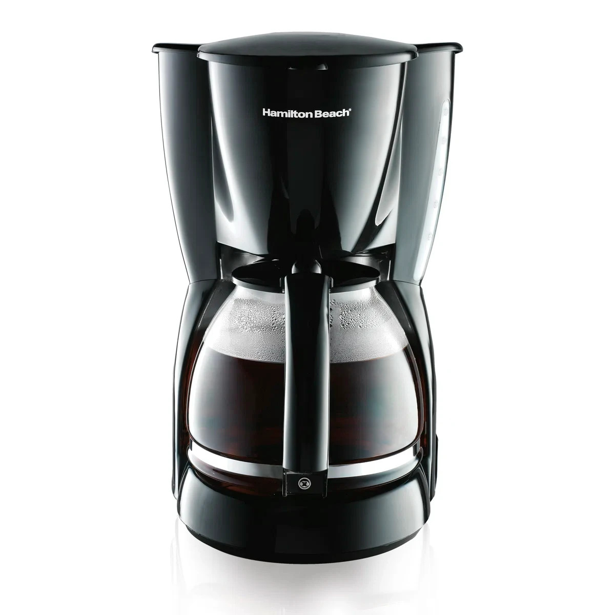 The Hamilton Beach® 12 Cup Coffee Maker extracts coffee's rich flavor with its hot brewing temperature and cone-shaped filter. The cone shape allows water to flow more evenly through ground coffee for great flavor extraction. The coffee maker comes with a sample pack of #4 cone filters. The removable, cone-shaped brew basket and glass carafe are dishwasher safe for easy cleaning, and the nonstick warming plate easily wipes clean. The Auto Pause & Pour feature automatically stops the flow of coffee so you can sneak a cup while the coffee's still brewing without making a mess. The water reservoir has a large easy-view window that lets you see the exact water level from the front of the coffee maker. The durable borosilicate glass carafe has a handle designed for comfortable pouring and measurement markings for accurate filling. The coffee maker is simple to use. Just add coffee, water, and brew with the push of a button to make up to 12 cups of great-tasting, hot coffee at home. The switch has a light that illuminates when the coffee maker is on to remind you to shut it off.