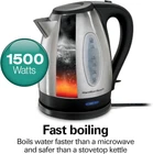 Hamilton Beach Electric Tea Kettle, Water Boiler & Heater, 1.7 Liter, Cordless Serving, 1500 Watts for Fast Boiling, Auto-Shutoff and Boil-Dry Protection, Stainless Steel (40880) FAST BOILING WITH 1500 WATTS: This electric kettle boils up to 1.7 liters of water faster than a microwave and safer than a stovetop kettle. Make a quick cup of tea, coffee and more without the long wait — perfect for hectic mornings. PEACE OF MIND WITH AUTO SHUTOFF: The automatic shutoff feature with boil-dry protection keeps the Hamilton Beach electric kettle from scorching if the water level gets too low. POWER INDICATOR LIGHT AND SIMPLE ON/OFF SWITCH: With an attractive blue power light on the front and a simple on/off switch on the back, this cordless electric kettle lets you easily boil and reheat water without any fuss. DURABLE STAINLESS STEEL WITH BPA-FREE INTERIOR: Designed for years of reliable, worry-free performance and long-lasting style in every kitchen. EFFORTLESSLY MONITOR THE WATER LEVEL: With the easy-to-view water window, you'll always know how much water is in the stainless steel electric kettle or how much water you've added when refilling.