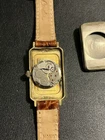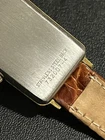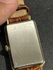 The Hamilton Geneva Mechanical Watch for men is a vintage timepiece featuring a classic dress/formal style with a gold plated case and black leather band. This watch has a unique left-handed design with a 12-hour dial and 17 jewels, showcasing a traditional mechanical (manual) movement from Switzerland. The buckle closure adds a touch of sophistication to this elegant wristwatch by Hamilton, making it a timeless accessory for any man's collection.