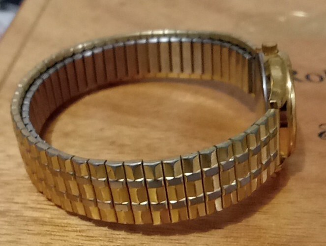 Women's SWISS Watch HAMILTON 9818. Logo on the dial. The watch has a white face with gold hands and number markers. Has a gold tone stainless steel stretch band. Swiss movement, water resistant, and needs new battery. The watch is in good condition no visible scratches on dial