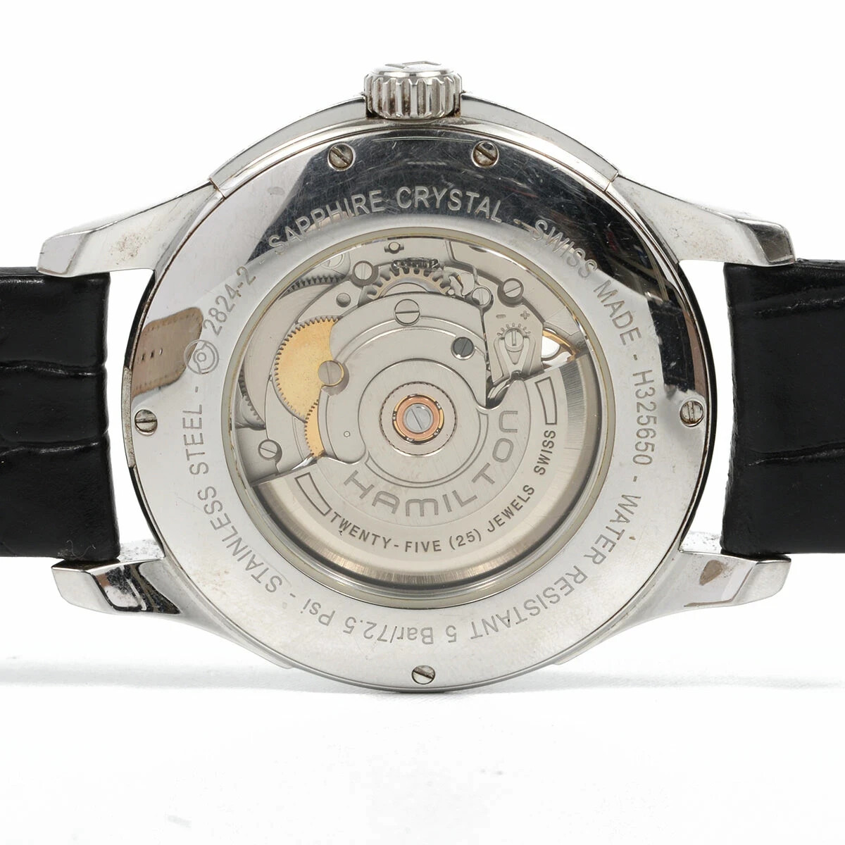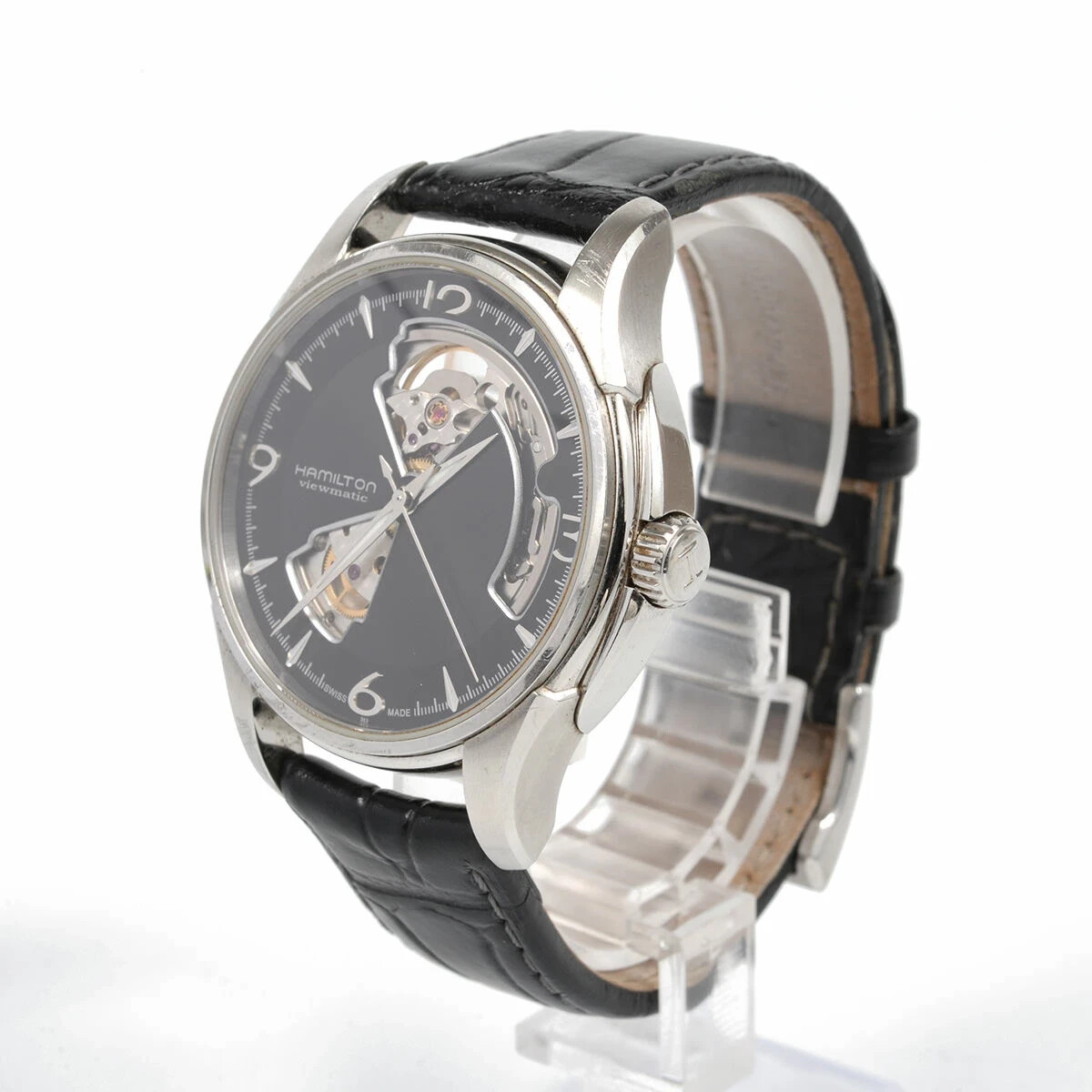 Watch Shape: Round Band/Strap: Two-Piece Strap Seller Notes: “Operation has been confirmed.Please check the condition by looking at the picture.” Type: Wristwatch Movement: Mechanical (Automatic) Handmade: No With Original Box/Packaging: No Department: Men Case Size: 40 mm Country/Region of Manufacture: Switzerland Case Color: Silver Water Resistance: NA Style: Dress/Formal Display: Analog With Manual/Booklet: No Vintage: No Customized: No Band Material: Leather Bezel Color: Silver Band Color: Black Reference Number: H325650 Seller Warranty: No Brand: Hamilton Dial Color: Black Model: Hamilton Jazzmaster Dial Pattern: Hearts Year Manufactured: NA Case Material: Stainless Steel