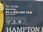 Hampton Bay Industrial 60" Indoor/Outdoor Ceiling Fan | Black w/ Wall Control & Reversible Motor About This Item Bring powerful, efficient air circulation to large indoor or covered outdoor spaces with the Hampton Bay Industrial 60 in. Ceiling Fan. Designed with a high-performance 194 RPM motor and three durable ABS blades, this fan delivers up to 9,999 CFM of airflow—ideal for great rooms, workshops, warehouses, patios, and other expansive areas. The included wired wall-mount control lets you easily select from four speed settings, while the reversible motor supports year-round comfort by pushing warm air down in winter and creating a cooling breeze in summer. Finished in sleek black, this industrial-style fan complements modern, commercial, and utility-inspired spaces. Key Features Powerful 4-speed reversible motor for year-round comfort Delivers up to 9,999 CFM airflow for large 20 ft. x 20 ft. areas and beyond Modern industrial design with black finish and matching ABS blades Wired wall-mount control included for convenient speed selection High-efficiency blade pitch for superior air movement Damp-rated for covered outdoor areas such as porches and patios Includes 6 in. downrod for standard mounting Ideal for workshops, garages, vaulted spaces, basements, great rooms, and more 24 in. lead wire for flexible installation Our Guarantee We take great care to inspect all items and ensure they are accurately described. Should you have any issues with your purchase, please let us know immediately. We are committed to resolving any concerns promptly and to your satisfaction. Our small business truly appreciates your patronage. hampton bay industrial ceiling fan 60 inch indoor outdoor black wall control reversible motor high cfm commercial fan workshop garage patio damp rated modern industrial air circulation large room fan