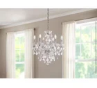 Maria Theresa 6-Light Chandelier bring an elegant, classic glow anywhere. A chrome finish and white candle lamp holder covers add eye-catching style to any decor. Adjustable hanging length with a maximum length of 60 in. lets you customize the look. Steel fixture with clear acrylic crystal accents in polished chrome finish Requires six 60-Watt maximum standard light bulbs, LED equivalent or CFL equivalent (not included) Includes 37.5 in. chain for adjustable hanging length Easy to install with the included mounting hardware Exclusively at the home depot Polished chrome finish Clear acrylic crystal accents in polished chrome Product Information Internet # 316462410 Model # HM-21022402 Store SKU # 189699 F60