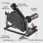 Hand Angle Grinder Converter To Cutter 40mm Depth Adjustable Grinder Bracket To Cutting Woodworking Table Tool With Guide Ruler Description: Material: Metal + Plastic Size: 205*220*155mm Color: Black Angle Range: adjustable 0-45 ° Cutting Depth: 0 ~ 40mm Applicable Model: 100~125mm angle grinder Applicable Saw Blade Diameter: Within 125mm Package Included: 1* Base Bracket 1* Dust Removal Pipe 1* Dust Collection Bag Specifications: 【Multi-angle Cutting】Adjustable cutting angle 0~45°, flexible cutting, convenient and fast 【Cutting Depth】High efficiency, easy cutting, cutting depth up to 40MM 【Auxiliary Backing Guide Ruler】Adjustable design of auxiliary backer guide, more precise slotting and cutting 【Upgrade Protective Cover】Upgrade to increase the shield. Angle grinder bracket is suitable for 100~125 type angle grinder (for saw blades within 125mm diameter) 【Dust-Free Cutting】Can be equipped with dust removal pipes and dust collection bags to achieve dust-free cutting 【Thickened Floor】Enlarge and thicken the bottom plate, it is not easy to deform, and the cutting is stable and not easy to deviate. Package Included: 1* Base Bracket 1* Wrench 1* Dust Removal Pipe 1* Dust Collection Bag
