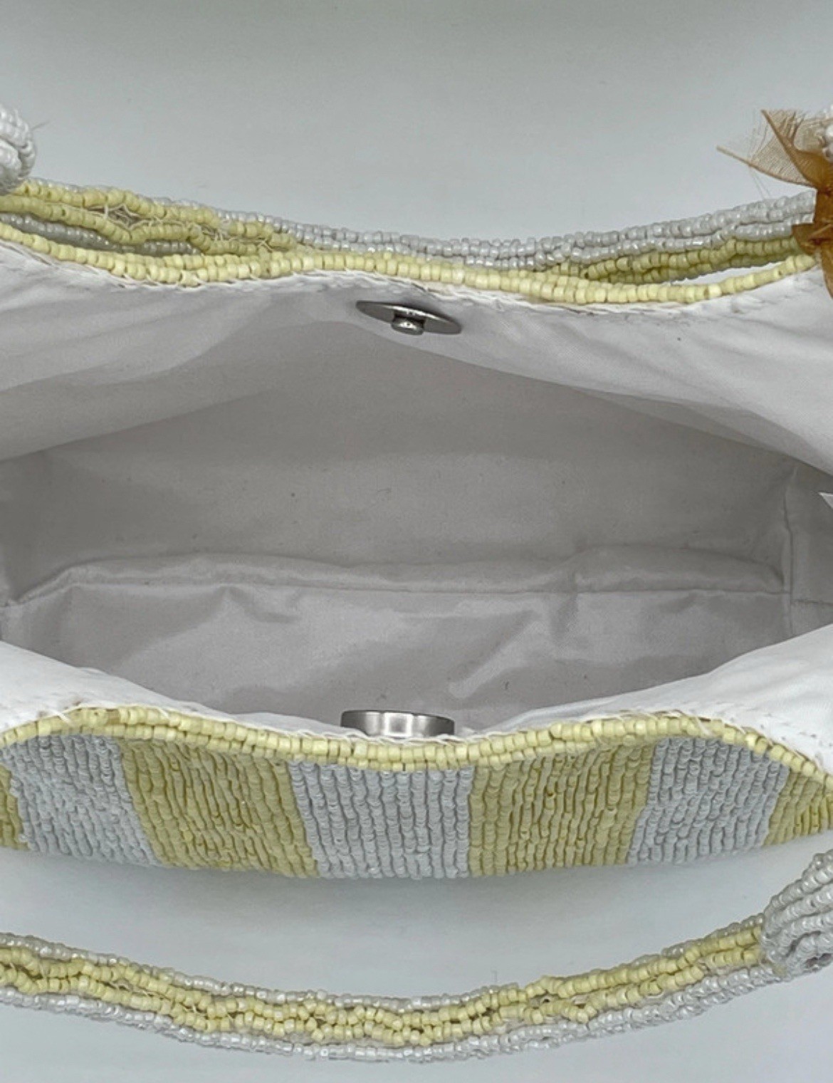 The hand beaded purse features a vibrant yellow and white striped pattern, made with hand-sewn glass beads and cotton material. This medium-sized handbag with double white handles and a magnetic closure is a stylish and eye-catching accessory that has gained popularity on Staud, Anthropologie, and TikTok. The purse is lined with satin and is handmade in India, adding a unique touch to your outfit. Perfect for adding a touch of sophistication to your look, this handbag is a must-have for fashion-forward women. #yellow stripe #tiktok #barbiecore #whimsie #quietluxury