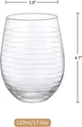Traditional Mouth Blown Craftsmanship: The modern technology of making a glassware by machine is fast and efficient. However, the traditional way of making a glassware by mouth and hand is more of an art. Each etched wine glass cup was carefully handmade by skilled blowers. No two pieces are exactly the same, making each piece a little different in size and shape, but also making each piece the only one in the world. Unique Etched Patterns Design: The dot strips and swirls patterns on this stemless wine glass cup set were carved by hand by skilled workers. The wine glasses are made from new raw materials, which looks clear and bright. The patterns are simple but sophisticated, which look nice and elegant, with both practical and decoration value. Since the patterns are carved on the glasses, you will never worry that the patterns will disappear. Specifications and Notes: For this etched stemless wine glass cup set, the height is around: 4.7"/12 cm, the top diameter is around: 2.8"/7cm, the capacity is about 520ml/17.6 oz. Packing Includes: 4 units. Notes: Dishwasher Safe. But for better preservation of the wine glasses, we recommend wash by hand. Great for Daily Use and Gifts: This etched stemless wine glasses are great for those who love drinking red wine, white wine, cocktails, champagne, beer, and some other mixed drinks. The unique design and craftsmanship makes it a good gift idea for home and bar essentials, Christmas, Birthday, Weddings, Anniversary, Mother's Day, Father's Day, Valentine, Thanksgiving Day, Teacher's Day, and so on. Brand Service: is an honest supplier with reputation. We offer free replacements 90 days after purchase without any reasons. If you have a question or doult, please be free to contact us via "Contact Seller". We will reply within 24 hours, and, we will propose solutions to solve your problem till you are satisfied.