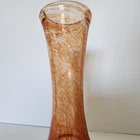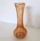 This vintage heavy hand blown glass bud vase has a bulb shape indicative of the mid-century period. The swirl or splatter pattern is made up of orange and peach hues giving this vase a very contemporary vibe. It measures 10" tall.