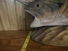This hand-carved wooden figure features two fish, a bass or a trout, standing on a pedestal. The intricate details of the carving make this piece a unique addition to any collection. The artist behind this piece is unsigned, adding to its mystery and allure. Crafted from high-quality wood, this figure stands at 17 inches long and is perfect for those who appreciate the beauty of fish and the art of woodcarving. Whether you're a collector or simply looking for a striking home decor piece, this figure is sure to impress.Preowned