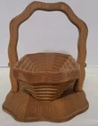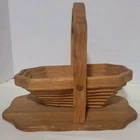 This handcrafted wooden basket is perfect for storing fruits, vegetables, and other items. The basket features a collapsible and folding handle for easy storage and transportation. The natural finish adds to its modern style and charm. Measuring 11 inches in length, 9 inches in height, and 8 inches in width, this medium-sized basket is perfect for any room in your home. Its weave pattern and rectangle shape make it a unique and beautiful addition to your home decor. The basket is an original piece, manufactured in 1970 and is perfect for collectors or as a decorative item.