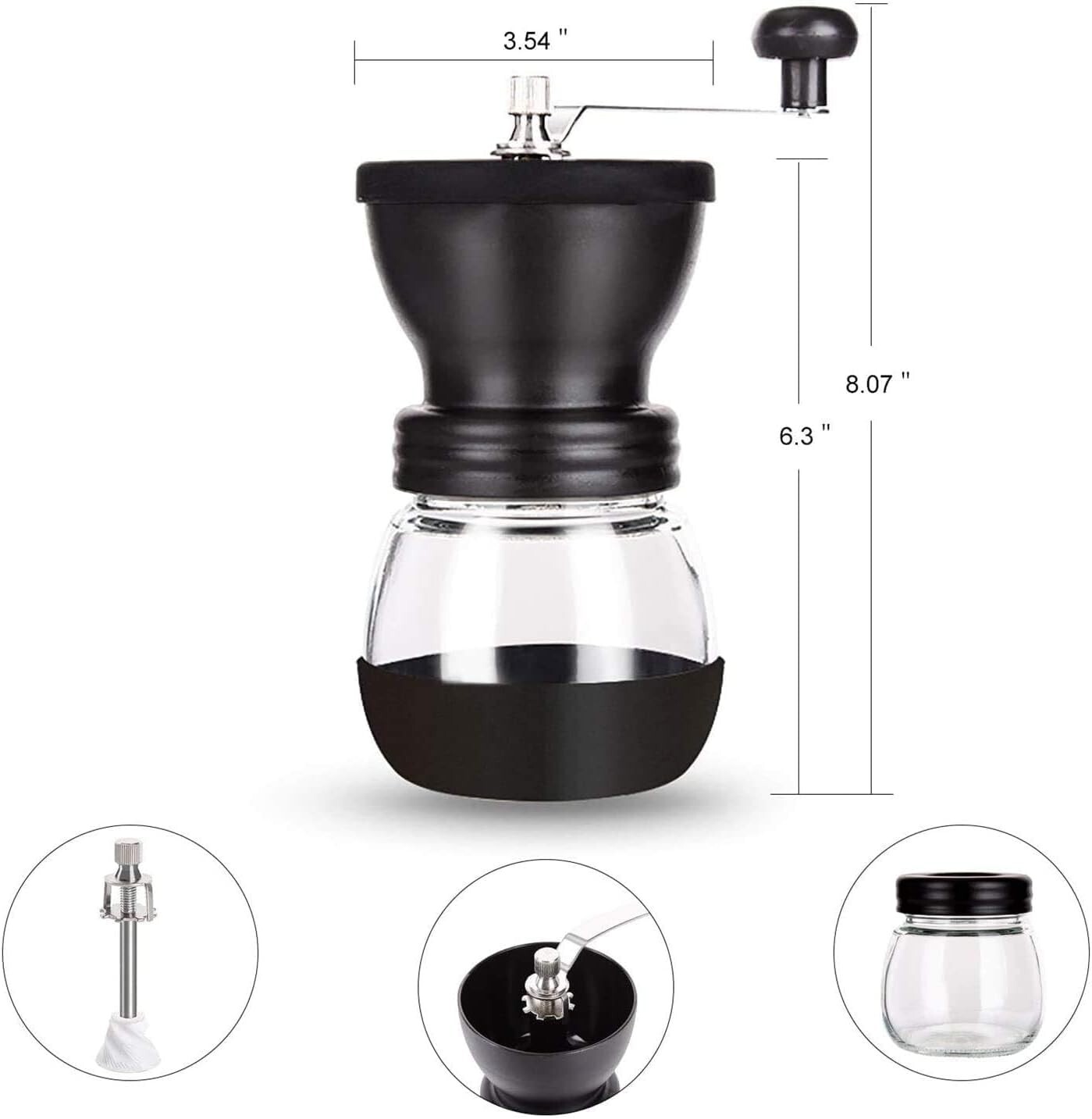 Product Details Color: Clear Material: Stainless Steel Item Weight: 0.85 Kilograms Recommended Uses For Product: Grinding Specific Uses For Product: Coffee Grinder Product Dimensions: 3.54"L x 3.54"W x 8.07"H Item Weight: 1.87 pounds Batteries required: No Manual coffee grinder comes with two clear glass jars, convenient to keep powders or beans during outdoors. Silicone lid is soft to touch and convenient to add beans. Nonslip silicone base keeps the coffee mill in place during grinding. The coffee grinder has a ceramic burr which ensures a precise, uniform grinding, avoid over heating of the coffee beans, maintain the flavor of coffee to a great extent, making this hand coffee mill the best choice of coffee lovers. Manual coffee grinder with adjustable control help you get fine or coarse coffee powder,ensures you have precision and control the coarseness of coffee beans when making French Press, Drip Coffee, Espresso,Turkish Brew etc. Lengthen stainless steel handle save your effort. The grinder is removable and assembles easily, which means all parts are washable. Please clean the grinder thoroughly after each use to make the coffee of fresh and flavor. Package include: 1* Manual Coffee Grinder, 1*Glass Jar ,1*Spoon,1*Brush. NOTE!!! The product is made of glass and can be easily damaged during shipping.