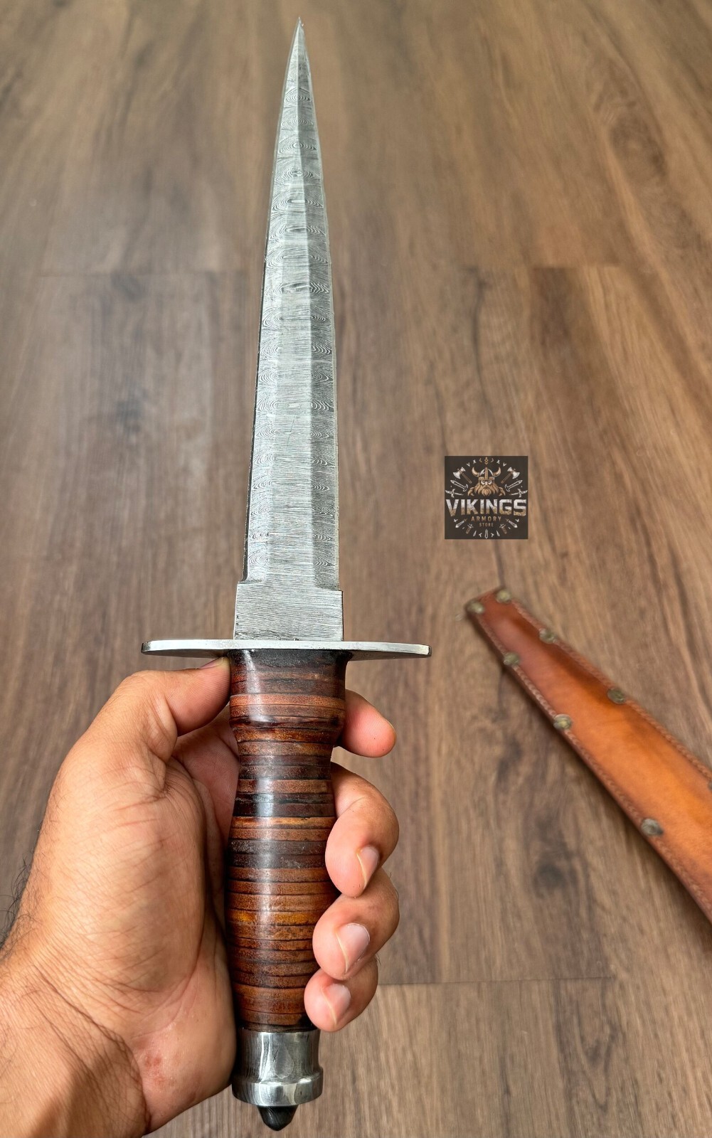 This hand forged Damascus Steel Dagger from Vikings Armory is a must-have for any knife enthusiast. With a blade length of over 5 inches and a plain edge, this drop point blade is perfect for hunting, survival situations, and everyday use. The blade is made of high-quality Damascus Steel and has a silver finish that adds to its aesthetic appeal. The dagger comes with a hidden tang and a wooden handle that provides a comfortable grip for ambidextrous dexterity. It also includes a sheath for easy storage and transportation. This original piece from Pakistan is a collectible fixed blade knife that is sure to impress. Overall Size Approximately 13 inches Handle Size Approximately 5 inches Blade Size Approximately 8 inches SHIPPING We use DHL or UPS normally. 5-7 Business days delivery and trackable easily. International shipping custom duty is paid by the customer, we are not responsible for the custom duties applied by your countries rules and regulations. For more queries contact us Customization Available Quality is Assure We deliver through DHL Please check Dhl Coverage area before placing order if your Address fall in DHL remote Area List You will have to pay $50 or change your Address Your satisfaction is very important for us if you have any issue contact us first before leaving any bad Review your issue will be resolved more efficiently ASAP Vikings_Armory