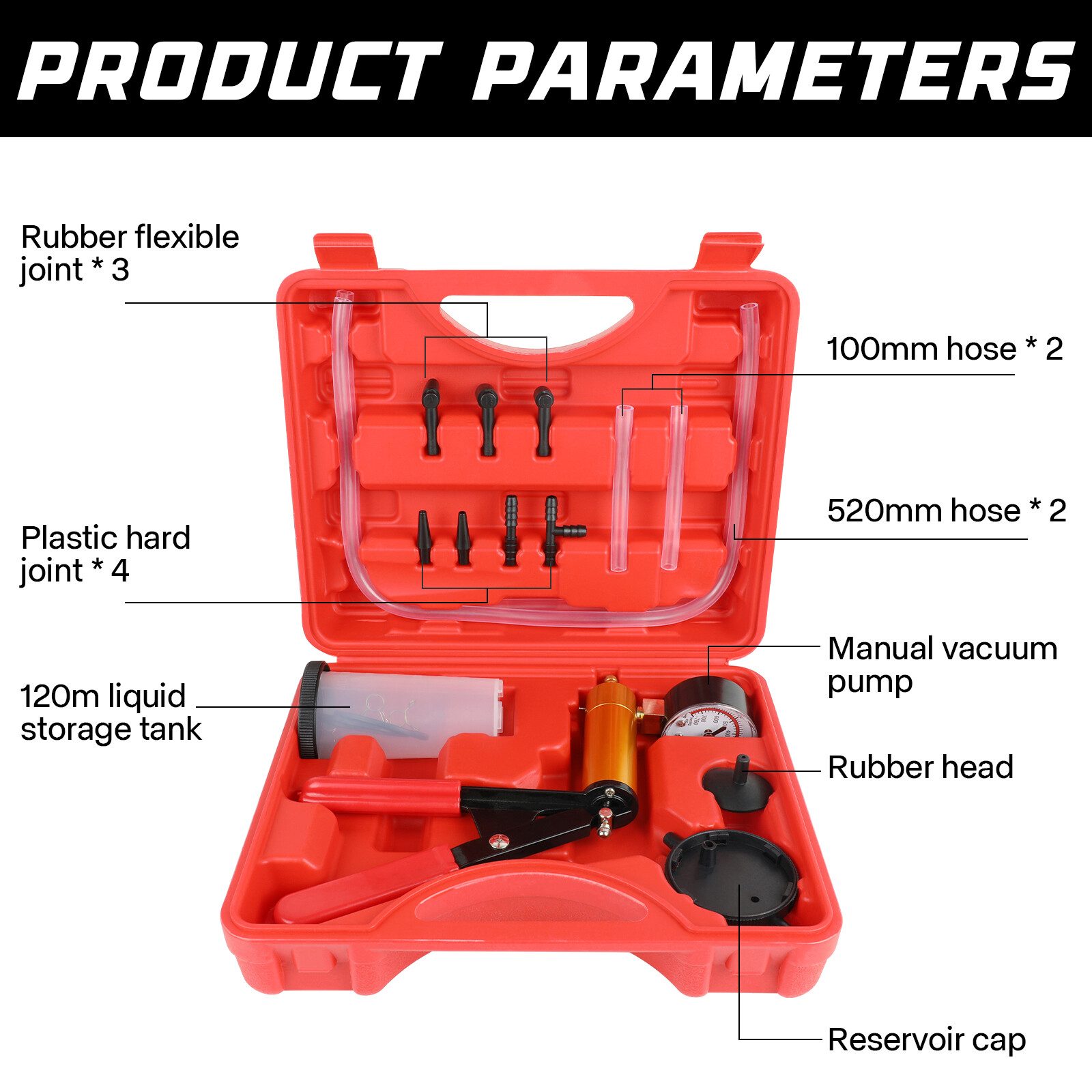 Hand Held Vacuum Pressure Pump Tester Kit Brake Fluid Bleeder Car Auto Tools New Note: Before the tool is ready for use, please make sure the parts match and finally check the connections of each part to avoid operating errors due to improper connection of the parts. Features: Multifunction: The brake breeder kit equips with vacuum gauge, help you read data accurately.Pressure range: 0-30 in Hg, 0-760 mm Hg. It includes accessories for both brake bleeding and automotive diagnose. Vacuum pump kit can test and diagnose a wide variety of parts and common systems on your bike motorcycle truck pickup or any other vehicle. Single operation: Our brake bleeder kit is suitable for sucking out waste oil and air, and guiding the new oil to fill all the system. The biggest advantage is that you can operate the bleeder by yourself without any assistant! Easy to Carry: Brake bleeder kit handheld carrying case is made of high quality material, durable and rugged enough. Perfect for both home and business applications and easy to transport and store. Complete Accessories: The hand held vacuum pump kit includes hand pump with gauge, 4.5OZ reservoir jar, 4 transparent hoses, 8 adapters and portable case, meets all your needs. 100% Satisfaction: We are responsible for every product. If you have any problems with our products or services, please contact us immediately and we will provide you with exceptional responses to your every concern. Specification Condition: 100% Brand New Material: Plastic & Iron & Copper Maximum Negative Pressure 0.3bar Dual Gauge Readings: 0-30in Hg, 0-760 mm Hg.Hg. Dimensions: approx. 25 x 21 x 8.3 cm/9.84 x 8.27 x 3.27 inch NOTE: Do not use the vacuum pump to siphon liquid, Damage to the internal chamber will result in seals Features Universal fit for all vehicles makes and models, Also fit for motorcycle brake bleeding, Cushioned pistol-grip handle on a vacuum pump for comfort and decreased user fatigue. Universal Brake Bleeder Kit Hand held Vacuum Pump Test Set Hand-held Vacuum Pump Brake Bleeder Kit Vacuum Pump Body Package Included 1x Hand Vacuum Pump 1x Reservoir Jar with Storage Lid 1x Liquid Transfer Lid 1x Universal Cup Adapter 2x Tapered Adapters for Hose 3x Brake Bleeder Valve Adapters 1 x "T" hose connector 1 x straight hose connector 2x 20" Transparent Hoses 2x 3" Transparent Hoses 1 x Carrying Case. Easy to Use The Hand held Vacuum Pump is easy to bleed your car brakes. Attach the tubing to the bleeder valve on a disc brake caliper, pump the vacuum, crank the bleeder valve, and watch the brake fluid flow through the tubing. Vacuum Gauge Cushioned pistol grip handle with vacuum gauge, simple operation; Easy to read out the pressure; Pressure range: 0-30in Hg, 0-760 mm Hg. Bleeder Vavle Various joints can be applied to a variety of vehicles. Payment Delivery details Terms of sales About us Contact us Payment We accept payment via PayPal, Visa, Mastercard, Apple Pay, Google Pay etc. Delivery details 1. Items are generally shipped out within 24-48 hours after your payment has been cleared (Sat. & Sun. excluded.) 2. Orders from the United States will all be shipped out via USPS/Fedex. The shipment usually takes 1-5 business days( Exclude public holiday), if you need the item urgently, please contact us for detail before purchase. 3. We ship to US ONLY and do not support Collection. 4. All items will be shipped to buyer's paypal address. Please check your paypal address before place the order. 5. We are not responsible for wrong or undeliverable address. We reserve the right to charge the shipping fee again for returned items due to wrong address. Terms of sales 1. We provide 30 days free replacement ,30 days money back on non-defective, undamaged, unused and resalable products. Product is not eligible for refund after the 30-day refund period has expired. 2. Our warranty does not extended to any products that are physically damaged or that are not under normal operating conditions as a result of misuse or improper installation on the buyer/user's part. 3. For all returned products, Please contact us for the returning address. 4. In all cases, buyers pay shipping fees at their own cost to return products for exchange or refund. We will be responsible for the postage of replacements. Refund will be made upon receipt of the returned item. About us (1) We are a store, mainly run laptop accessory. Such as laptop battery , tool battery, ac adapter etc. (2) All item passed FCC / CE / ROHS certificates. Help buyer reduce the risk of damage, fire, dangerours mostly. (3) We work with a good quality OEM supplier and factory. Help you and us save money greatly. Contact us - You don't need to pay for eBay Square Trade for getting covered by our warranty policy. - There is a warranty label on our products like batteries and adapter chargers, please keep it safe and sealed. - We don't cover the failure or damage caused by misuse, accident, modification, inappropriate physical or operating environment, natural disaster, power surge, and improper maintenance or storage. - If you misuse the eBay Return Policy, our warranty to your purchase will be revoked. - Please contact us via eBay message if you have any problem and please allow us 24 hours to reply, we will do our best to help you solve it.