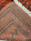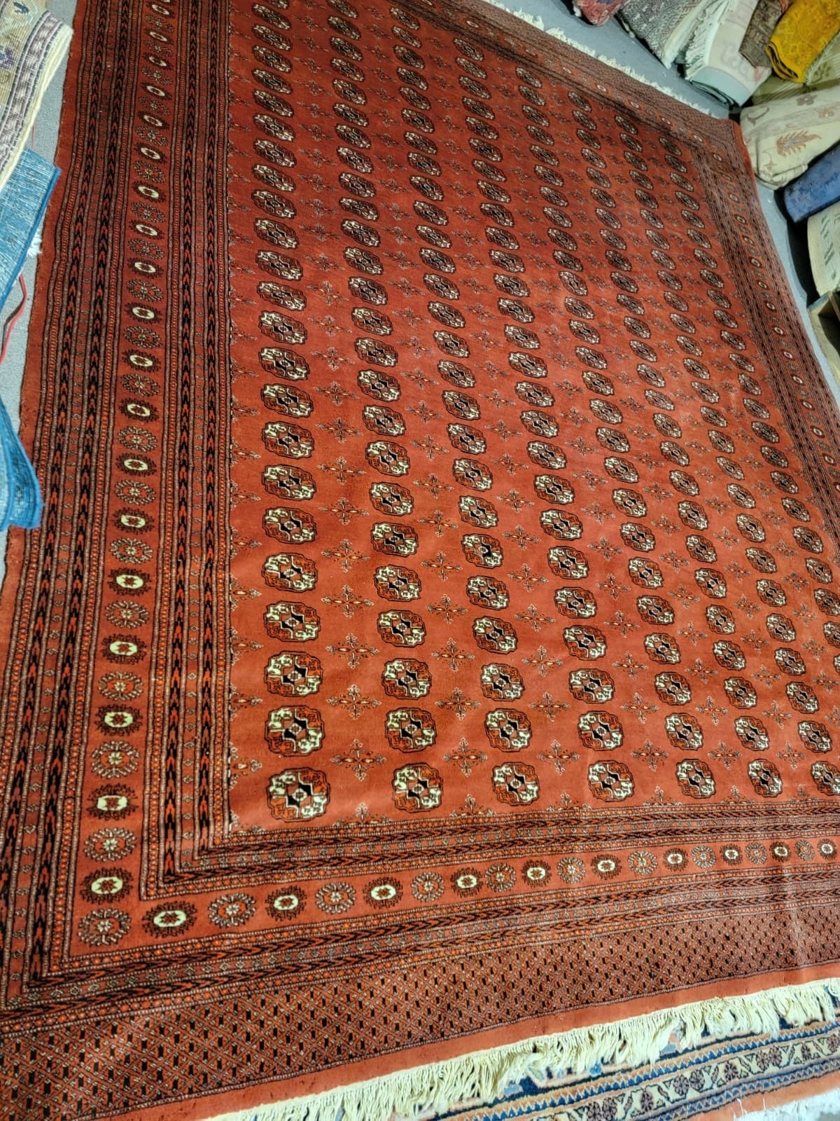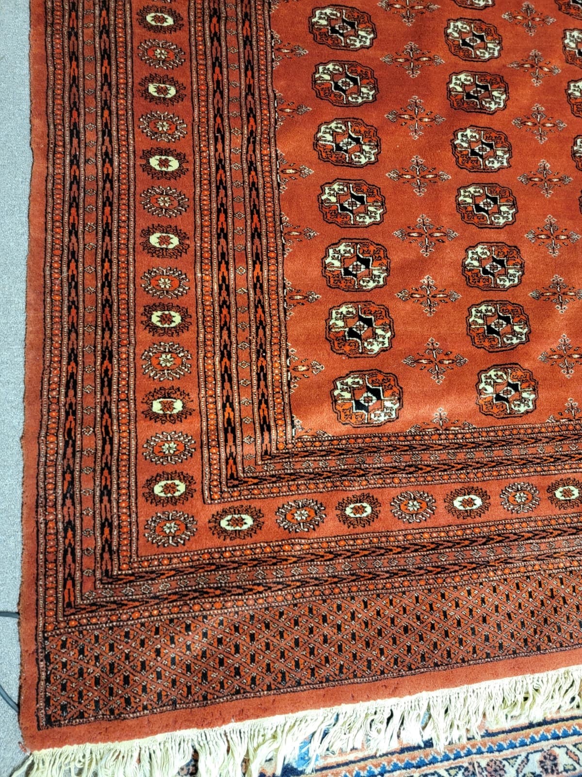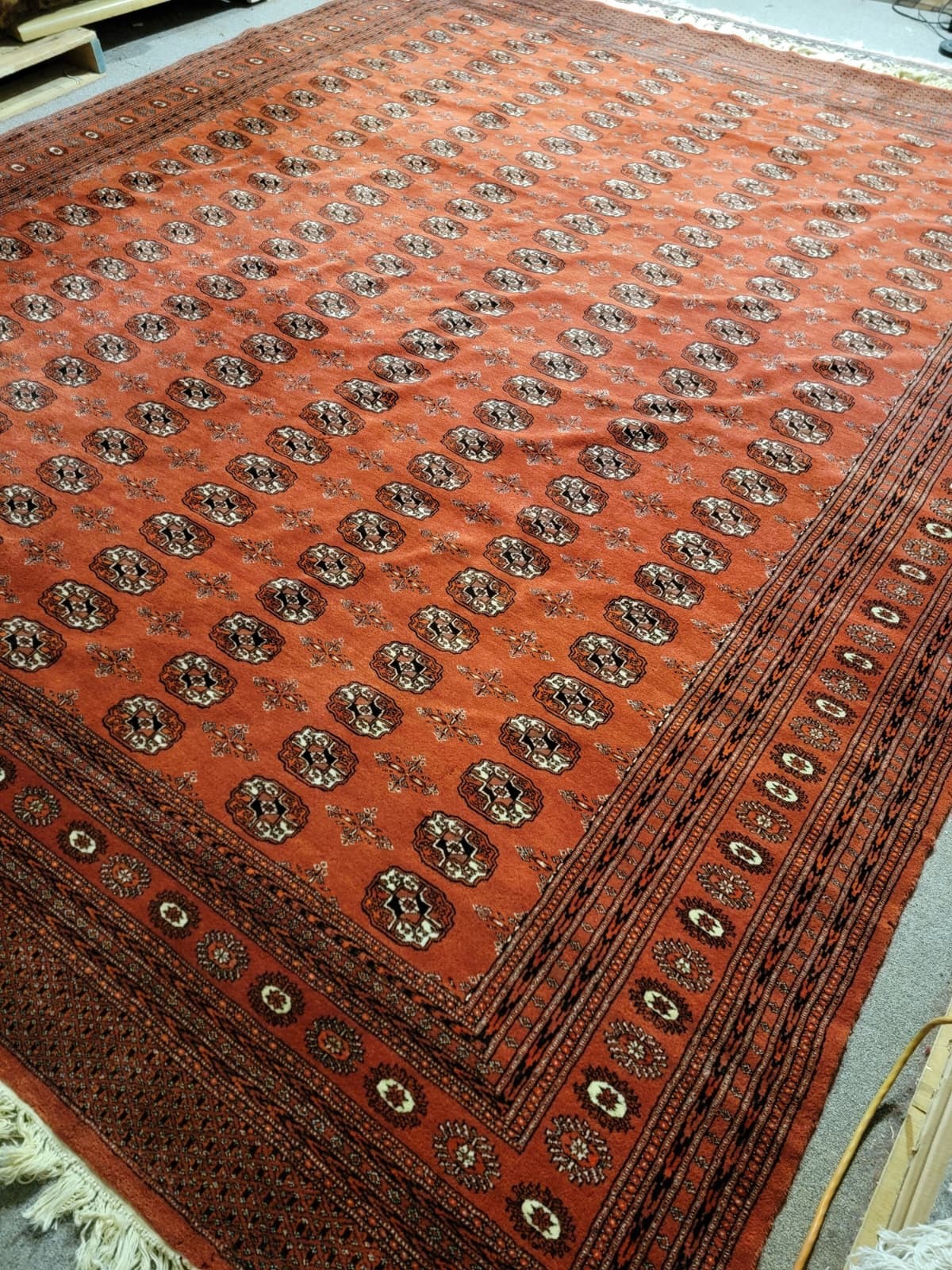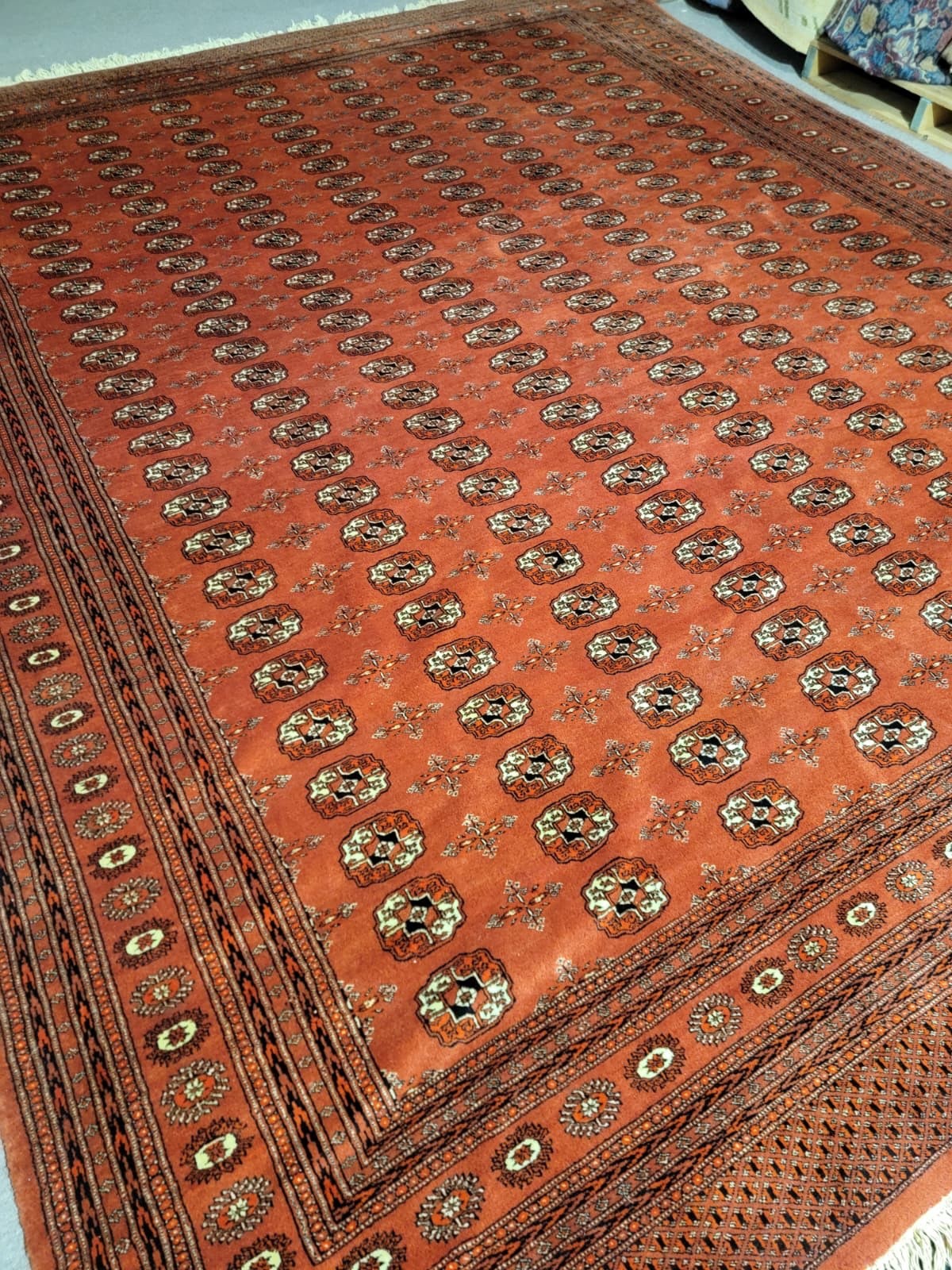 This vintage 9x12 hand-knotted rug features an all-over Elephant Foot Gul pattern in a rich orange color, perfect for adding a traditional touch to any room. Made from 100% wool with a medium pile height, this rug showcases the intricate craftsmanship of Bokhara regional design. Handmade by artisans, this original area rug is ideal for use in the bedroom, living room, or dining room, adding a unique and authentic touch to your home décor.