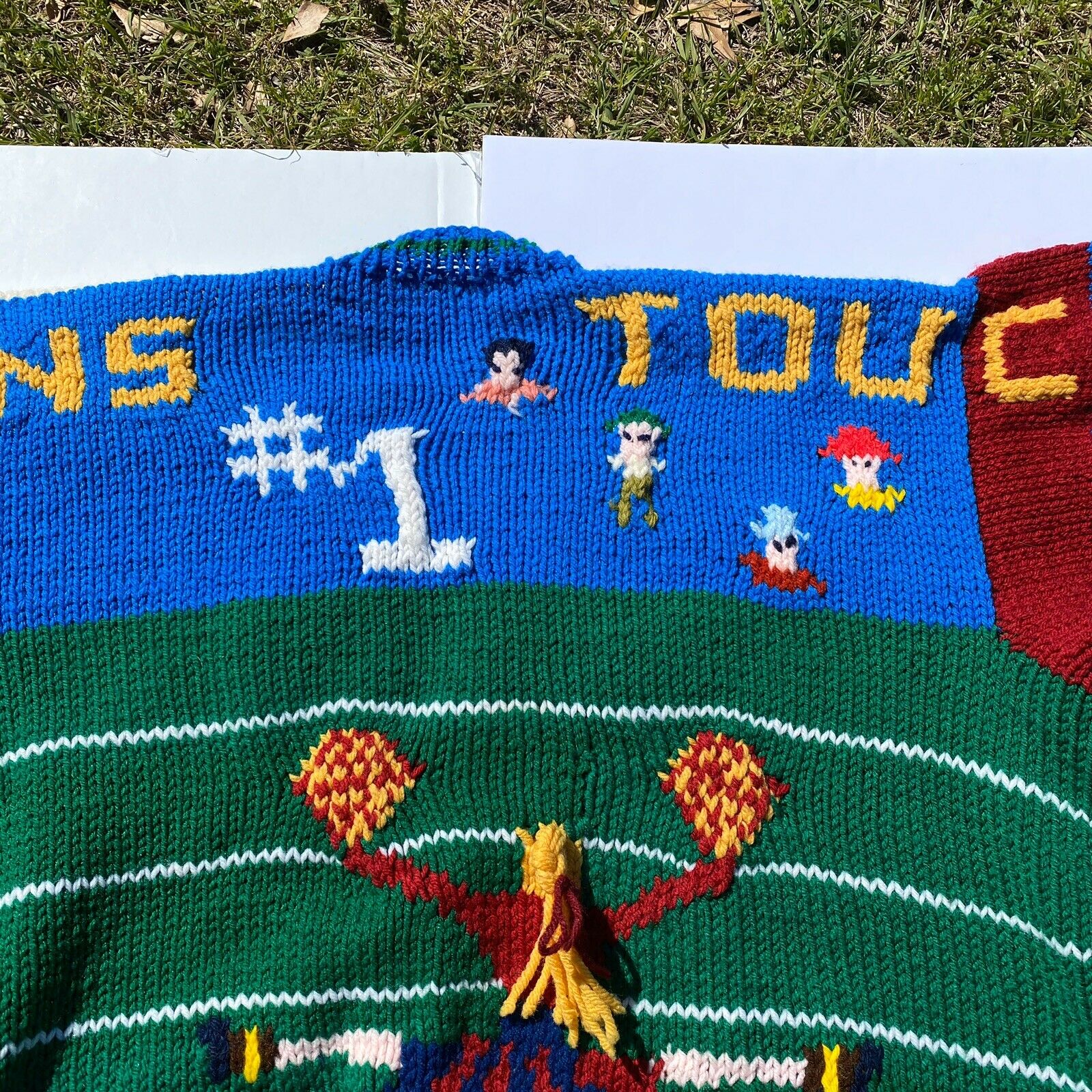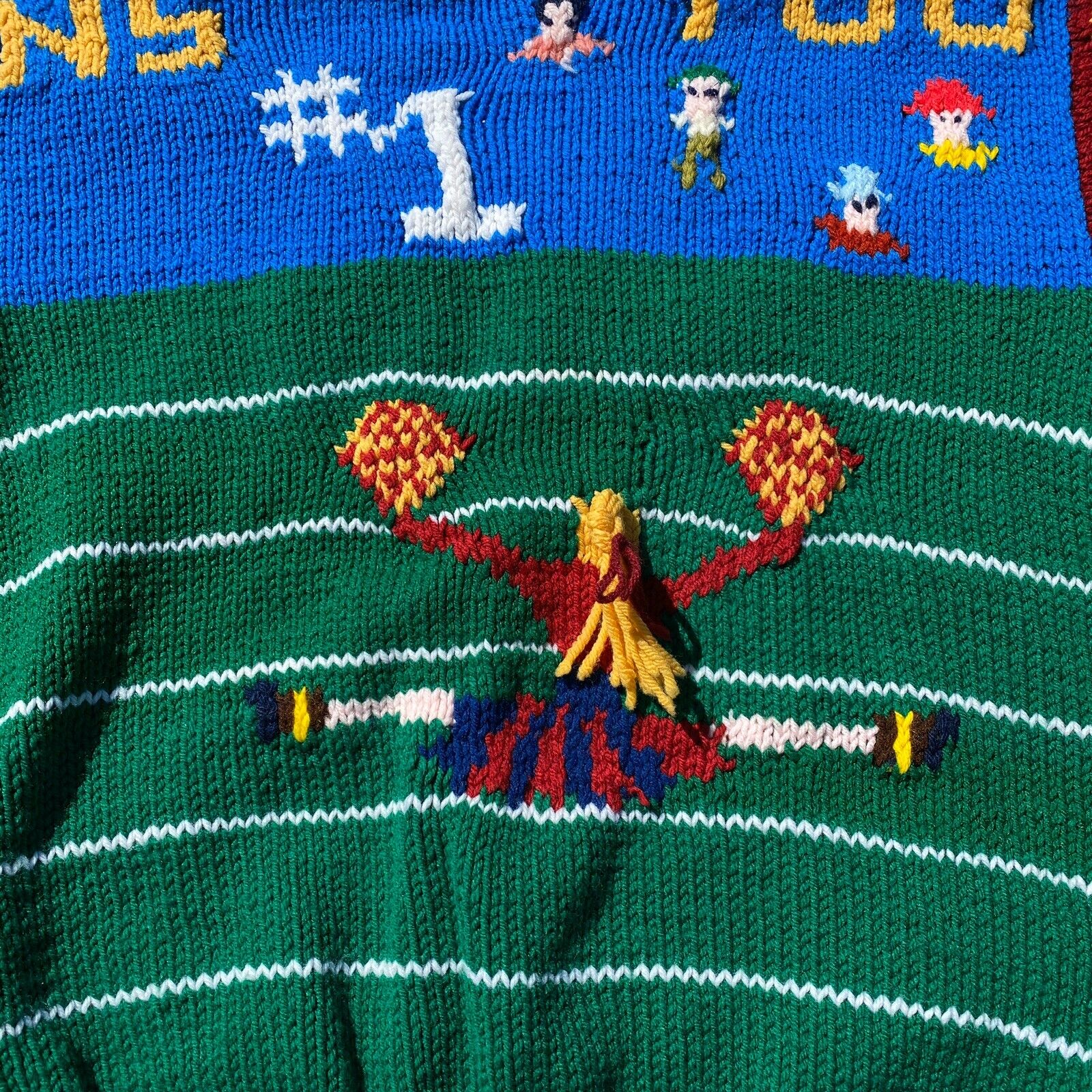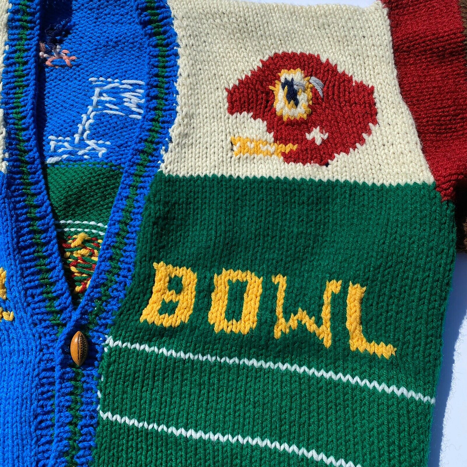 Washington Redskins Super Bowl Hand Made Knit Sweater - VG condition Hand make, Knit sweater to celebrate (or commemorate) one of the Washington Redskins' Super Bowls. No rips or tears or signs of misuse or excessive wear (it's not like Washington has been close to a Super Bowl in many, MANY years). An obvious project of love, the sweater features some nice workmanship with a helmet, a mug of Cocoa and popcorn on the front, Touchdown Redskins across both sleeves, and a football field with a cheerleader doing a jump splits (with tuffs of yard as her hair). Quite Cool. I wear a large, and this fits me well. I would say it's a tad smaller than a large, but quite wearable by a large. Laid flat, it measures 22" from the top of the collar to the bottom hem, 22" across the bottom. Sleeves measure 20" from the top shoulder seam to the cuff. Cute footballs for buttons. Just a great hand-made project, perfect for that Redskins fan. #1911