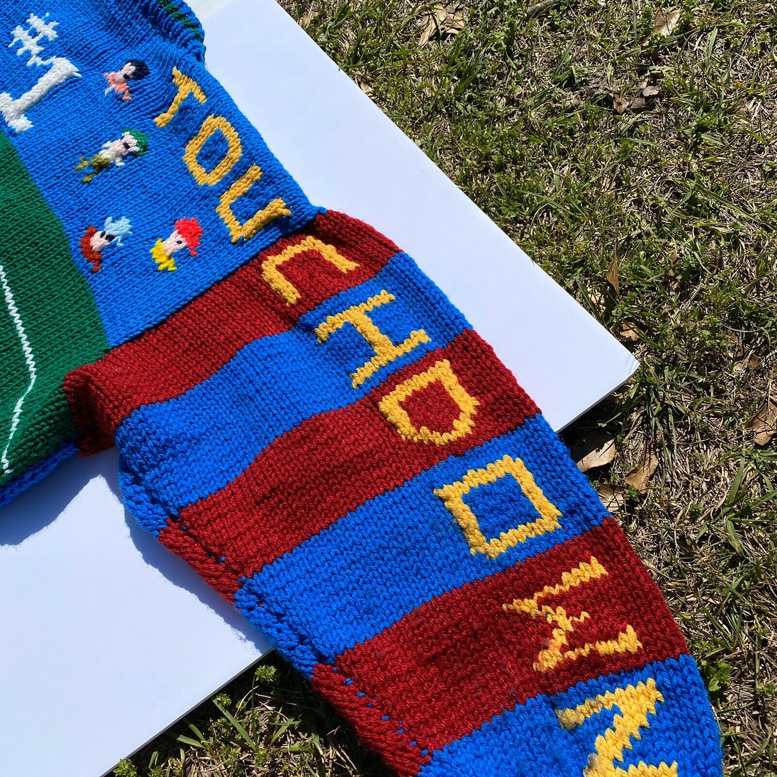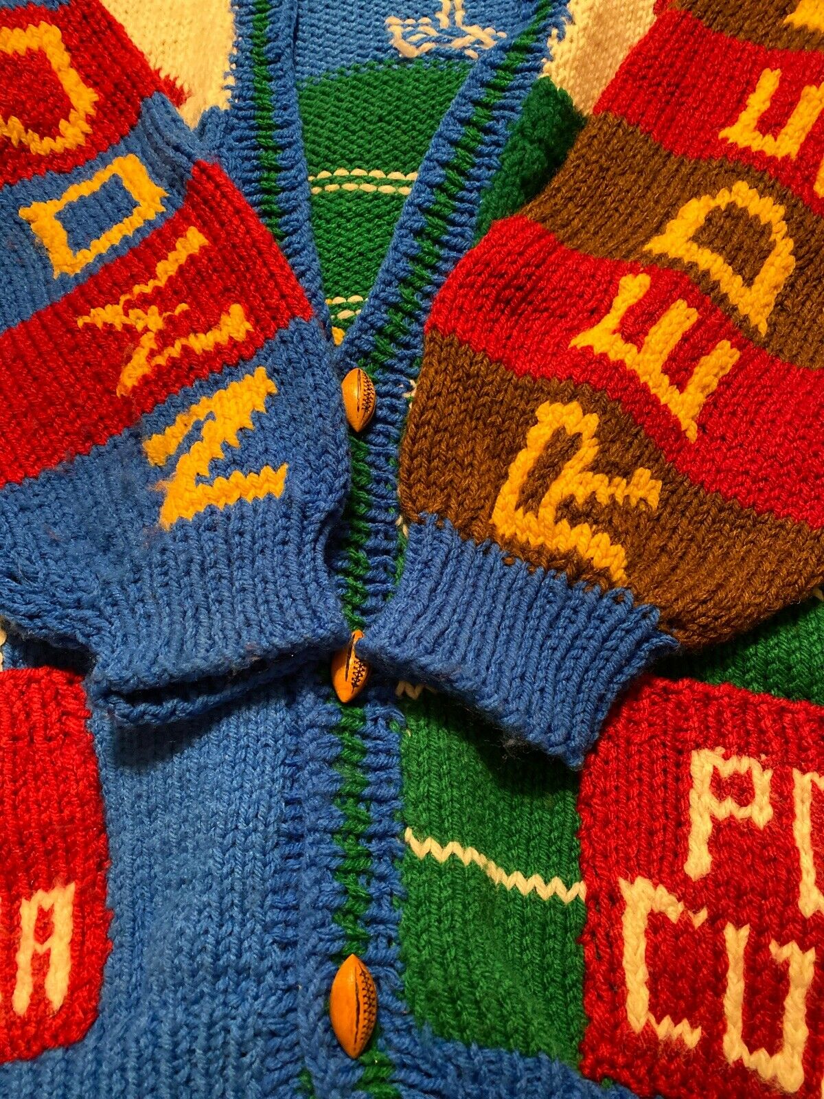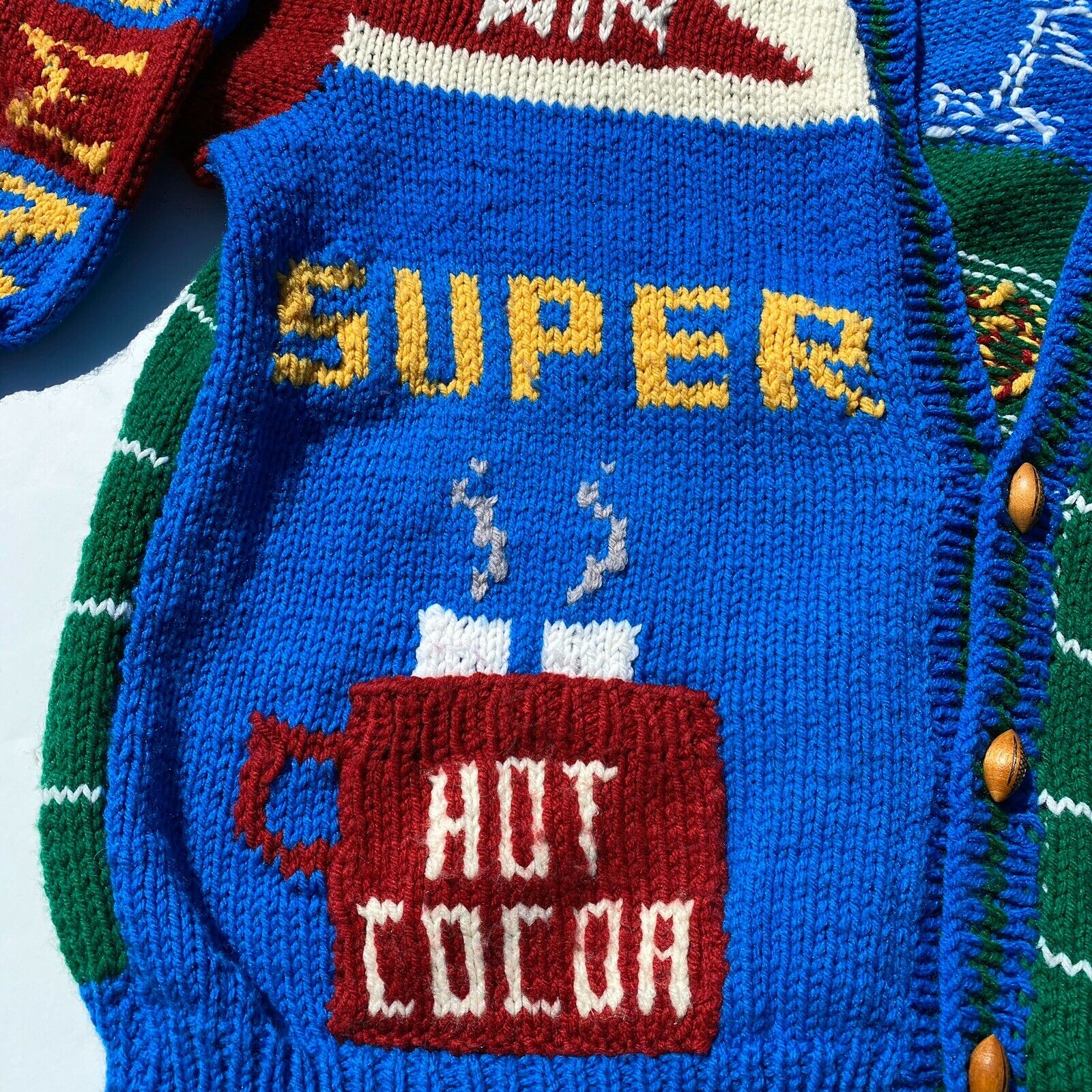 Washington Redskins Super Bowl Hand Made Knit Sweater - VG condition Hand make, Knit sweater to celebrate (or commemorate) one of the Washington Redskins' Super Bowls. No rips or tears or signs of misuse or excessive wear (it's not like Washington has been close to a Super Bowl in many, MANY years). An obvious project of love, the sweater features some nice workmanship with a helmet, a mug of Cocoa and popcorn on the front, Touchdown Redskins across both sleeves, and a football field with a cheerleader doing a jump splits (with tuffs of yard as her hair). Quite Cool. I wear a large, and this fits me well. I would say it's a tad smaller than a large, but quite wearable by a large. Laid flat, it measures 22" from the top of the collar to the bottom hem, 22" across the bottom. Sleeves measure 20" from the top shoulder seam to the cuff. Cute footballs for buttons. Just a great hand-made project, perfect for that Redskins fan. #1911
