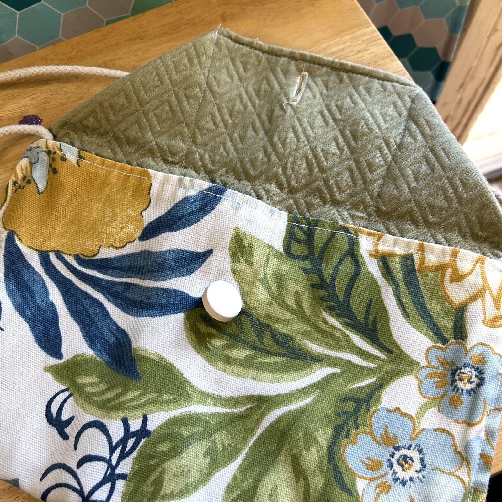 Hand Made in USA purse / Bag 12" long 8" tall green yellow blue floral leaf rope shoulder strap lined green material beautiful see pictures You ARe Enough 2092. $25 9 oz