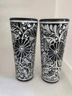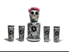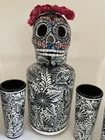 Hand Painted Decanter Set (Frida) with 2 Shot Glasses Unique Hand-Painted Bottles and Shot Glasses. -Handmade artistic creations of Mexican tradition that represents Mexican culture to the world. The Bottle. -One of a kind Hand-Painted Decanter Set, skillfully crafted by an Artisan in Mexico. Artisans never repeat the same painting pattern. The delicate process for the elaborate design of the bottle takes the artisan several hours to complete. The head is a handmade clay skull and painted fully to compliment the covering design of the bottle. The bottle is not only a decoration but it also has the functionality to be filled with any desired liquor, transforming this PIECE OF ART into a beautiful utility. The bottle holds 750 ml. (25oz) and comes With a cork, so you can refill it with any spirit or liquid. The shot glasses hold 2 oz. (60ml.) each. Simbolism. The Skulls in the Mexican culture represent a tribute to passed beloved ones. It is a fundamental piece of the altar for the Day of the Death as a form of commemoration for those who once brought happiness. The Day of the Death is a festival to honor the memory of lost loved ones who are believed to come back to visit their family from the afterlife