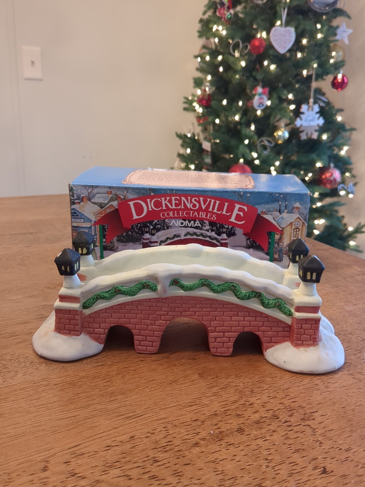 This is a Lemax Dickensvale Collectables Christmas Village accessory featuring a hand-painted porcelain lamp bridge. The product is made in China and is designed as part of a holiday-themed collection. In original box