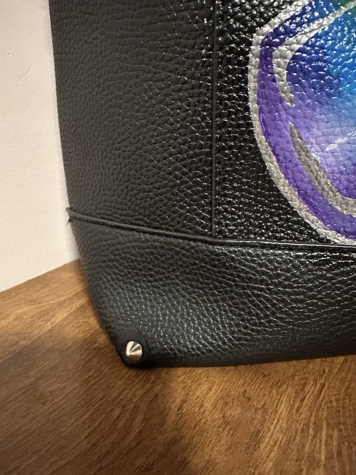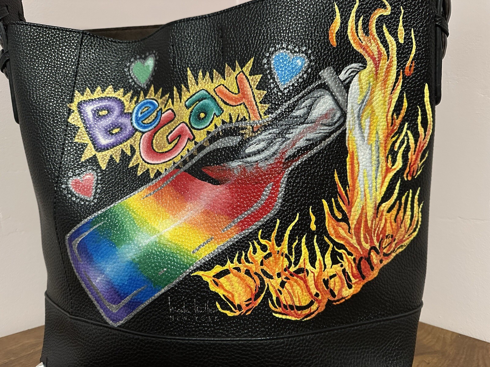 Pre-owned large tote bag in good condition and thoroughly cleaned. Hand painted with Angelus acrylic leather paints and heat set. Sealed with Angelus finisher to resist cracking and peeling with normal use. To clean, wipe with soft damp cloth. Item ships in a black satin dust cover bag for storage when not in use. Be Gay! Do Crime! Rainbow Molotov cocktail themed Artist does not reproduce items. One of a kind item.