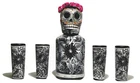 Hand Painted Decanter Set (Frida) with 4 Shot Glasses Unique Hand-Painted Bottles and Shot Glasses. -Handmade artistic creations of Mexican tradition that represents Mexican culture to the world. The Bottle. -One of a kind Hand-Painted Decanter Set, skillfully crafted by an Artisan in Mexico. Artisans never repeat the same painting pattern. The delicate process for the elaborate design of the bottle takes the artisan several hours to complete. The head is a handmade clay skull and painted fully to compliment the covering design of the bottle. The bottle is not only a decoration but it also has the functionality to be filled with any desired liquor, transforming this PIECE OF ART into a beautiful utility. The bottle holds 750 ml. (25oz) and comes With a cork, so you can refill it with any spirit or liquid. The shot glasses hold 2 oz. (60ml.) each. Simbolism. The Skulls in the Mexican culture represent a tribute to passed beloved ones. It is a fundamental piece of the altar for the Day of the Death as a form of commemoration for those who once brought happiness. The Day of the Death is a festival to honor the memory of lost loved ones who are believed to come back to visit their family from the afterlife
