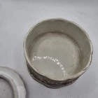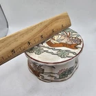 This beautiful Chinese porcelain round trinket box is a must-have for collectors of Asian art. The box features hand-painted vintage embossed birds and water design, making it a unique addition to any collection. It was made in China and is a perfect representation of Chinese culture. The box is also handmade, adding to its value and charm. The trinket box is perfect for storing small items such as jewelry, coins, and other keepsakes. Its elegant design and intricate details make it a wonderful display piece as well. This box is a great addition to any home decor and is sure to be a conversation starter. There is a crack inside the lid. See photos for imperfections sold as is