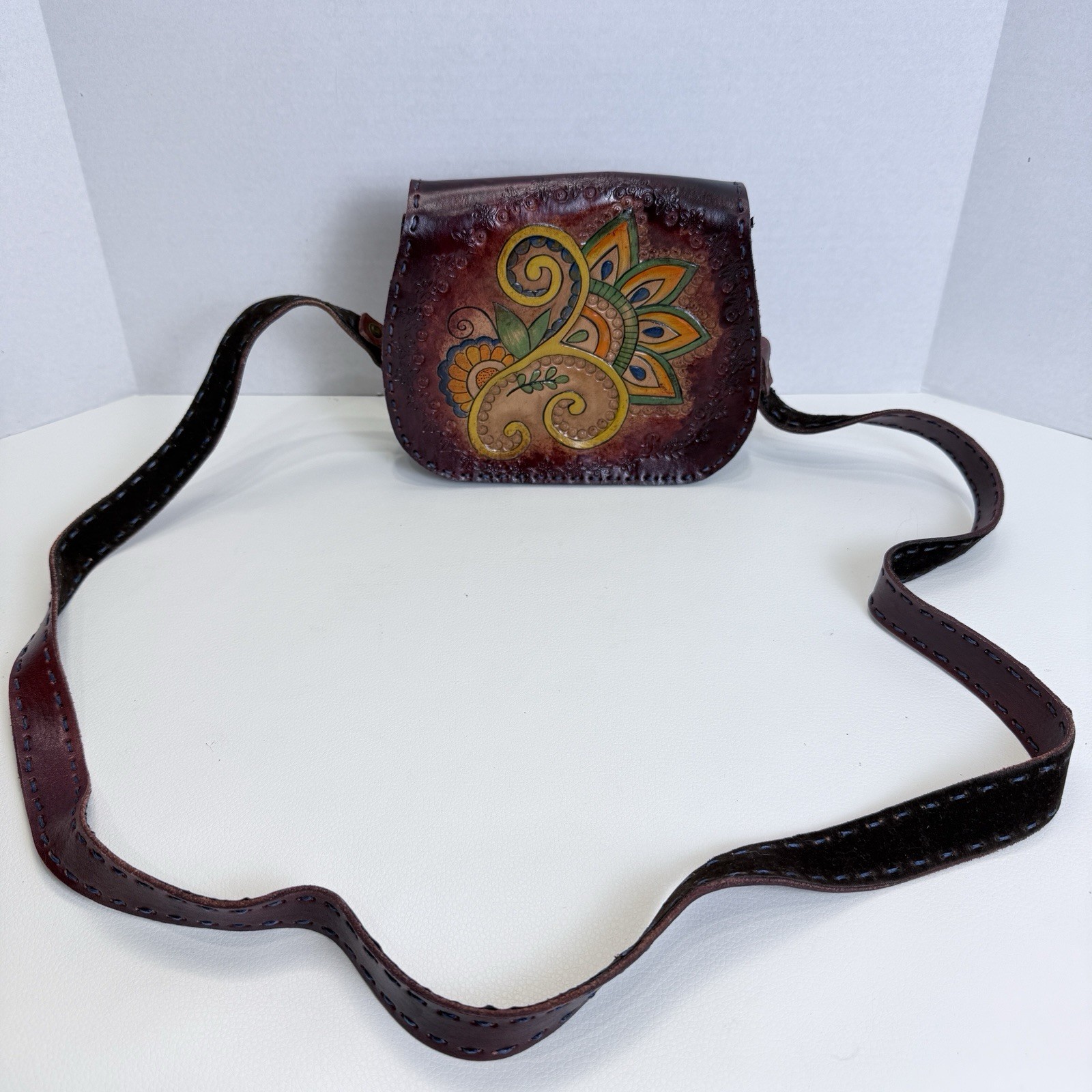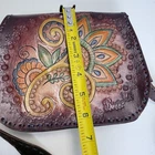 Beautiful artisan-made hand-tooled leather crossbody bag featuring a vibrant floral-paisley motif and detailed embossing. Rich burgundy leather with decorative stitching. Interior includes a velvety lining and small zippered pocket. Snap closure. Condition: Pre-owned good condition with minor flaw: Rip on the zipper lining. Minor creasing. Next business day shipping! Thank you for supporting my small business!