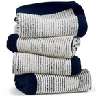 Decorative Hand Towels for Bathroom: The 4 hand towels are made of 100% cotton, the edges are wide navy-blue color, and the middle is white, individual textured lines; The stylish jacquard weaved design makes them both beautiful and practical, especially great for bathroom decoration Soft & Comfortable – Each hand towel has 56 intricately woven lines, each line has more than 1600 loops, so, each surface has more than 89,000 terry loops. This high-density texture provides a soft and gentle feel, perfect for everyday use Durable & Color-Fast – Thoughtfully designed with reinforced edges and double-stitched corners to enhance durability. The medium-weight 3.8 oz fabric strikes a balance between absorbency and breathability. Thanks to our reactive dyeing process, the colors stay vibrant wash after wash Long-lasting: We’ve poured care into every inch; Each 3.8 oz towel, perfect in its medium thickness, boasts edges that are diligently reinforced; Corners? Double-stitched for longevity; And with our reactive dyeing process, you’ll find the colors remain bright and fresh, wash after wash For Every Occasion: Whether you're decking out your guestroom, need a gym companion, want a stylish presence near your kitchen sink, or looking for a thoughtful gift, our set of 4 towels has got you covered; The jacquard design isn't just an aesthetic choice; it's a statement of elegance