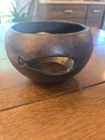 Small, decorative handcarved wooden bowl with 2 fish and a turtle carved out on the sides. The bowl is 4 1/2" across and 3 1/2" high. It is signed "Morning Glory 2011" on the bottom. It is in beautiful shape and would be a perfect addition to any earthy or boho style home.