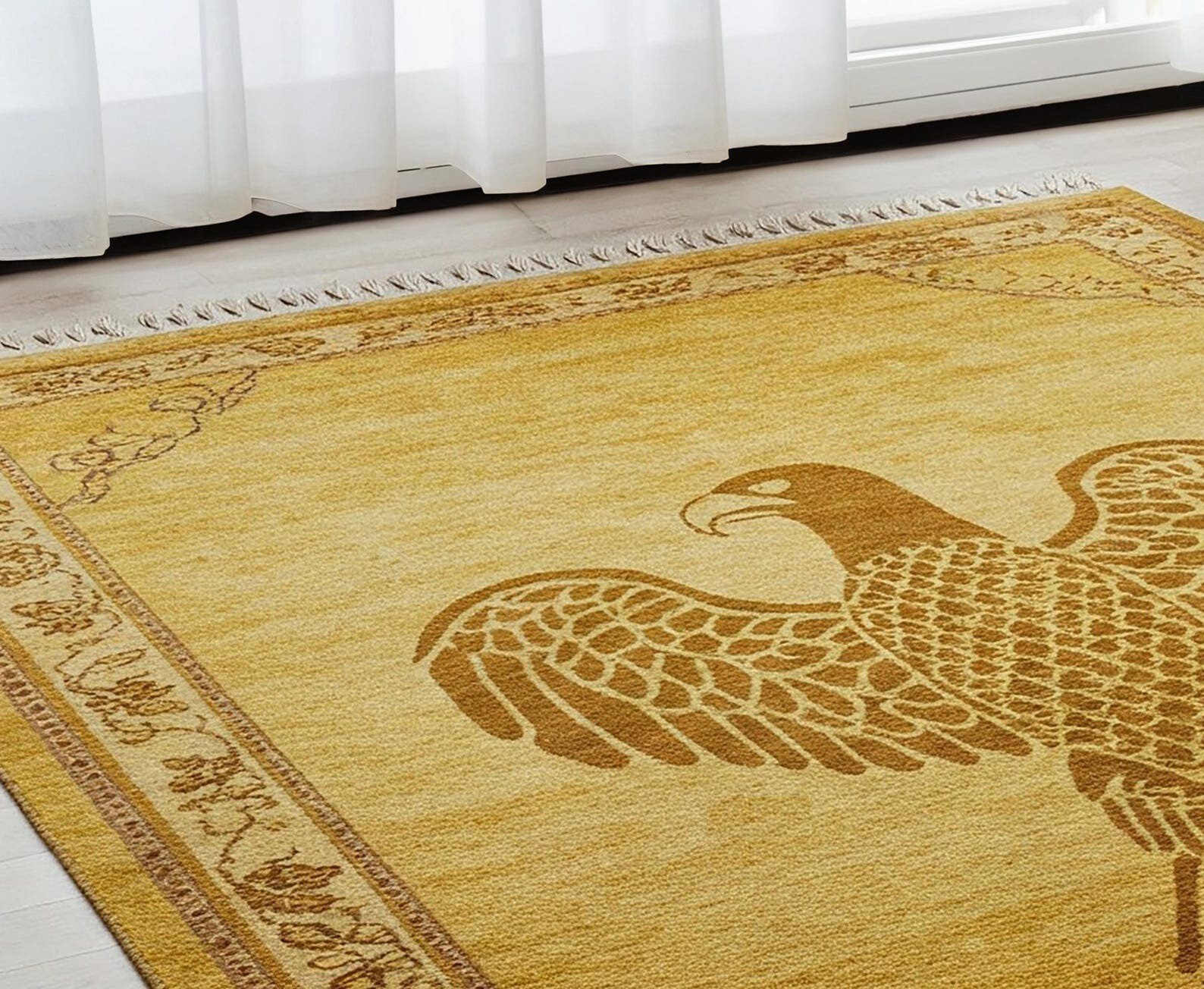 Add a touch of timeless elegance to your space with this stunning hand-knotted wool carpet featuring a majestic eagle motif. Expertly crafted by skilled artisans, this luxurious rug boasts rich golden tones with intricate floral and vine borders, bringing both warmth and sophistication to any room. Made from premium-quality wool, it ensures durability, softness underfoot, and lasting beauty. Perfect for living rooms, offices, or formal settings, this rug is not just a floor covering — it’s a statement piece. Material: 100% Wool Technique: Hand-Knotted Design: Eagle Center Motif with Traditional Floral Border Color: Golden Yellow with Brown Accents Size: [Add Your Size Here] Features: Durable, Soft Texture, Eco-Friendly, Handmade Care: Professional Cleaning Recommended Transform your interior décor with the elegance and craftsmanship of this unique hand-knotted carpet! All Carpets in My Store are Made up of 100% wool, this exquisite hand Knotted rug is durable with a gentle feel. A medium-thick pile in contrasting heights adds delightful decorative complexity, while still maintaining softness & warmness underfoot. The defining details of this rug are sure to make it a conversation piece and an icon of your household. It is a joy to step out of bed in the morning onto these rugs and also perfect for rolling out in a calming nursery or a delightful playroom. PLEASE NOTE:- The images we display have the most accurate color possible. Due to differences in computer monitors, we cannot be responsible for variations in color between the actual product and your screen. Please be advised that in some cases patterns and colors may vary according to size Feedback 1. We depend on our customer satisfaction to succeed. therefore, your feedback is extremely important to us. 2. If you are satisfied with our service, please leave positive feedback to us. thank you! 3. Contact us before leaving any negative or neutral feedback, we will try our best to solve any problems. Terms 1. We will check all the product before shipping to you. 2. If the item is defective, please contact us at once, we will send a solution the first time. 3. Any import charges or fees are the buyer's responsibility. 4. Please check out your ADDRESS carefully when processing an order. 5. Feel free to contact us with any question or query, and any other things like for bulk orders or any custom order we will offer you a satisfying answer. Shipping: All items will ship promptly after payment has cleared Payneer. Please provide the correct and updated address and Contact Number for shipping. Usually takes 5-15 business days for the delivery. Note :- We offer Free Shipping All Across The World. Thanks for Visiting UK HOME FURNISHING
