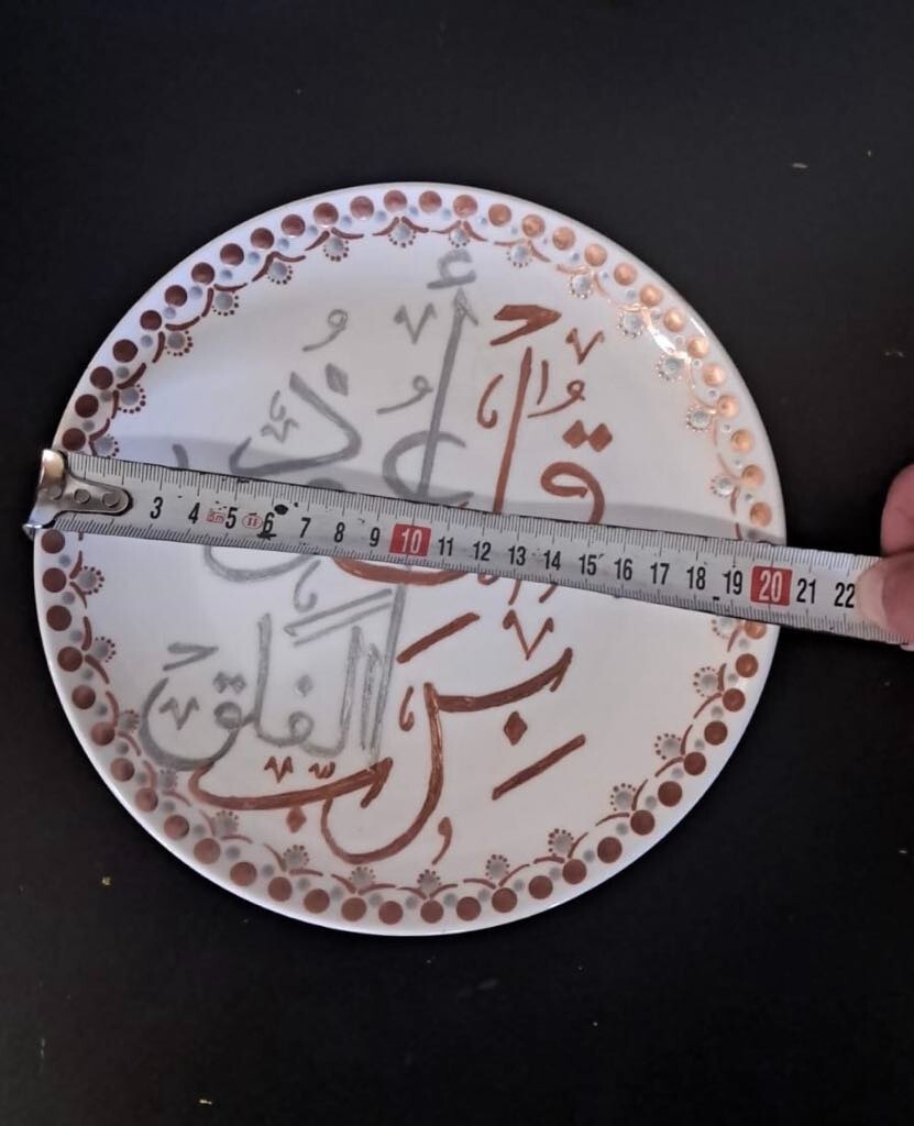 WELCOME Porcelain Decorative Collectible Plate Hand-Painted Art Saucer Arabic Words Quran اول كلمات من سوره الفلق With Stand Description: Item: Plate Material: Psoralen + Psoralen Colors Circle diameter size: 20 cm = 7.8 in Weight: 443g Very Beautiful Handmade Artist Work Please review all photos closely, since they are a large part of my item description (all made with daylight, to show the color as authentic as possible). Shipping I do worldwide shipping by Registered mail with a tracking number. Shipping takes up to 21 business days All additional payments such as tax, are the buyer’s responsibility. Return policy I checked each product and I sell only the best quality ones. In any case, if you are not satisfied with the product please get in touch with me and I will do everything for your satisfaction. You have a 100% guarantee and refund; it is only accepted within 14 days in its original packaging and the condition of the item you bought must remain the same. Buyers pay for shipping and all additional payments such as tax. Feedback: I give immediate positive feedback to buyers as soon as the payment is received for the purchase. In any case, if there is a problem contact me right away before leaving feedback. I will do my very best to resolve any problem that occurs and satisfy you . Thank you for shopping 😊