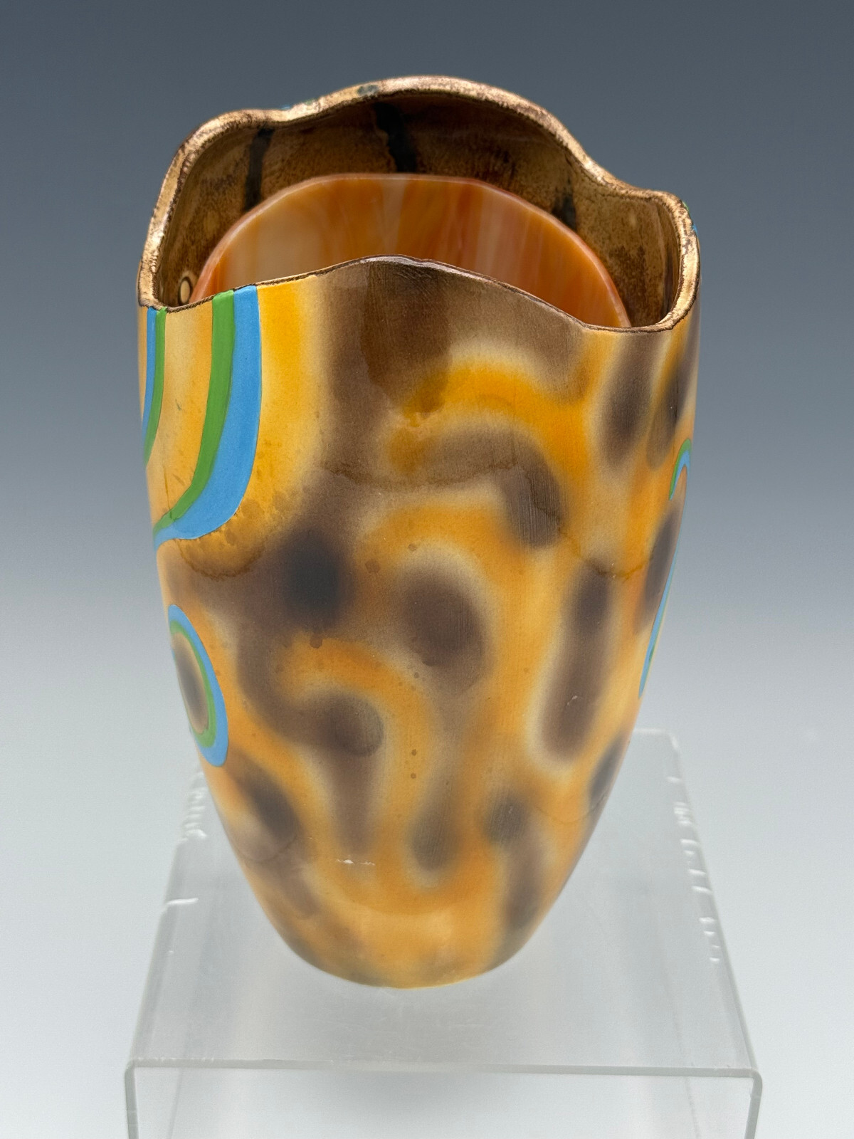 Up for your consideration is this very interesting studio crafted vase. It is a combination of ceramic with a slag glass insert. This measures 5 1/2" across and 8 1/2" in height. The base is signed, but we could not find any information out about this studio. There is a small scuff on the back and a teeny nick shown in the photos that may be from when the vase was made. Please check out our photos and message with any questions. Thank you for visiting. This is a fun retirement gig for us. We try our best to describe all our items as accurately as possible. You can count on customer service being our priority. Got any questions? Feel free to drop us a message via eBay anytime. We are happy to combine shipping of items. If you purchase multiple items and we can combine them safely, we will refund you for the over payment of shipping. Please do not worry, we do this everyday. Please be patient for a response from us, we are not always online. We take pride in delivering 100% satisfaction, evidenced by our feedback. If you aren't entirely happy with your purchase, don't wait! Just drop us a line. We'd much rather partner with you than have negative feedback left. We aim to ship your items within 3 days of the sale. Most of our packages will be shipped out USPS or FedEx. We only use quality shipping materials and do not pack with old dirty boxes and newspaper. We take pride in making sure your items are treated with detailed attention so you will receive them intact. Our goal is to get your treasures to you safely. Occasionally you may see a refund from us for shipping costs after your items are packed. We are just passing back any over payments for shipping paid. If you get a damaged package, don’t worry! Just give us a shout and we'll sort it out.