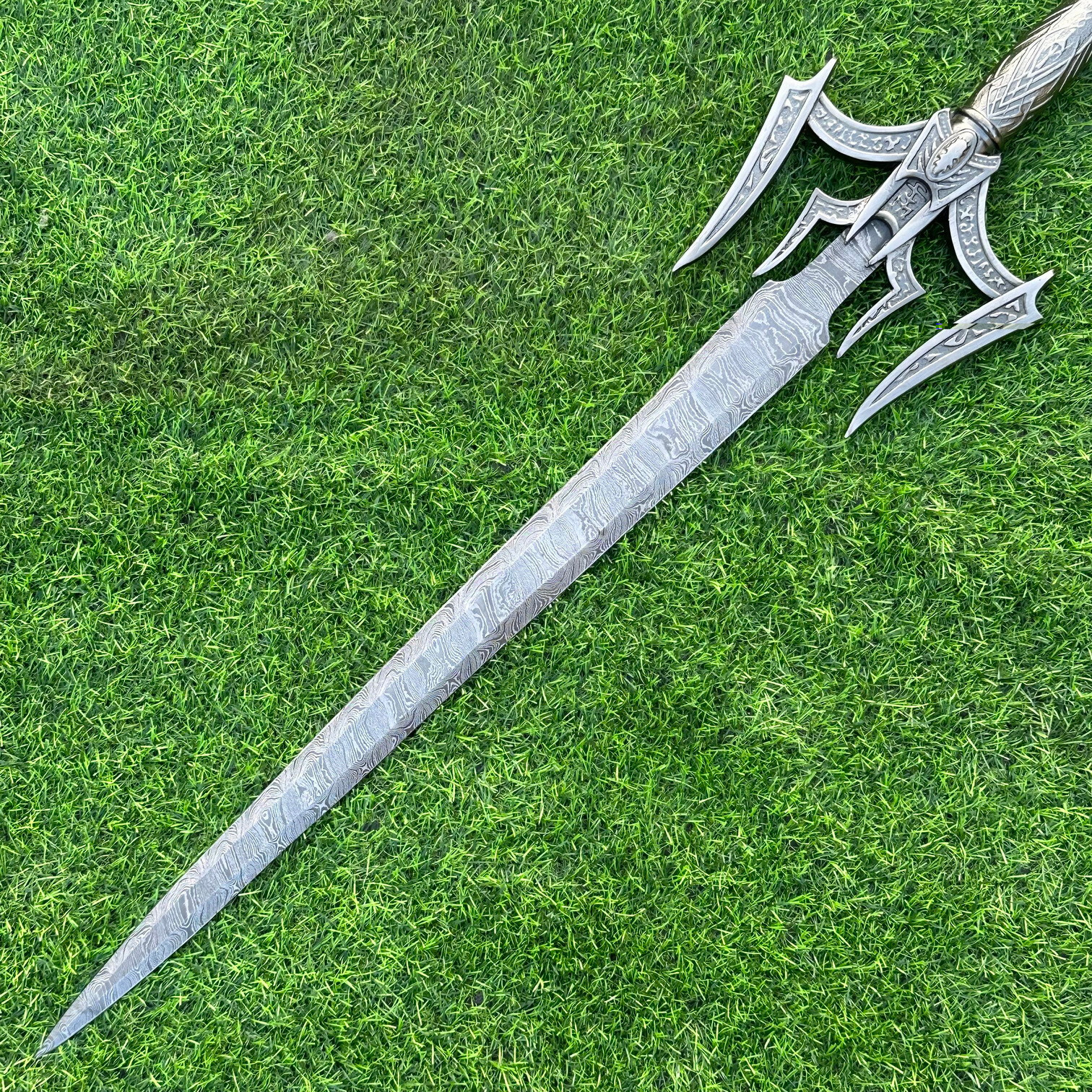 EXCLUSIVE HANDCRAFTED Damascus Steel Blade: A Legendary Sword for the Modern Warrior, Medieval Sword Swords Battle Ready, Hand Forged Sword, Damascus Sword, Long Sword, Viking Sword, Sword, Wedding Gift, With sheath Product Details: Overall Length: Approximately 34.0"inches (Approx.) Blade Material: Genuine Damascus Steel Blade Hardness: 54-58 HRC Handle Material: Pewter Size Verification: To help you easily determine the size, we've included images with a scale for precise dimension reference. Thank you for your understanding. We appreciate your consideration. Included Accessories: Sheath -excellent husband wife gift -Wedding gift -Father's Day gift -Mother's Day gift -Birthday Gift -Groomsmen gift -Christmas gift -Luxury Gifts For Men -Anniversary gift for husband -Thanksgiving Gift For International Customers: We kindly advise our international customers to familiarize themselves with their country's regulations prior to making a purchase. If customs in your region request customs duties, please be prepared to cover these costs. Regrettably, we cannot assume responsibility, nor issue refunds in such cases. Our Damascus Steel Creation Process: At our workshop, we take immense pride in crafting authentic Damascus steel knives that surpass mere acid etching. Here's an overview of our Damascus steel-making process: 1. Material Selection: We meticulously combine 1095HC and 15N20 nickel carbon steel for our blades. 2. Layering: The chosen steels undergo repeated heating and folding to achieve a remarkable 384 layers. 3. Acid Burn: Following the layering process, the blade is treated with acid, revealing the brilliant nickel shine and a dark gray hue in the high carbon steel, thereby showcasing the stunning Damascus patterns. 4. Blade Finishing: Concurrently, we expertly sharpen the blade's edge, transforming the acid-treated edge into a striking satin finish. Our unwavering commitment to preserving the authenticity and craftsmanship of Damascus steel ensures that each knife in our collection showcases intricate layers and delivers exceptional performance. AGE LIMITATION: Please note that we exclusively sell knives to individuals who are 18 years of age or older. Additional Details: Leather Sheath (if pictured): Rest assured, this item comes with a superior-quality, sheath. Crafted with meticulous hand-tooling and stitching, it exemplifies fine craftsmanship and is designed for exceptional durability. The added stitching ensures it withstands years of demanding use, providing reliable protection for your knife throughout its lifetime. Care and Maintenance: When necessary, use a Diamond Wet Stone or a superior sharpening tool to maintain a 20-degree blade edge. After use, clean the item with soap and water, ensure thorough drying, coat it with gun oil, and store it separately from the sheath. Leather absorbs moisture from the air and can lead to blade rust if stored improperly. Customer Feedback: Your satisfaction and feedback are of utmost importance to us. We genuinely appreciate your positive reviews! When assessing shipping time, please consider international transit. Your recognition bolsters our confidence to enhance our services. If you encounter any issues with your order or product dissatisfaction, please reach out to us first. We are committed to resolving any concerns to your satisfaction and kindly request you not to leave neutral or negative feedback. Payments & Returns: All accepted eBay payment methods are available for this purchase. Our return policy typically extends to 14 days. Shipping and Handling: We offer free shipping on all our products (In the USA) Tracking Info: The buyer will receive the tracking number via email (if available). You can also track the shipment in the "Order Details" section on eBay. USPS UPS DHL updates tracking information nightly (if available). Contact: Feel free to contact us anytime via eBay messages. We are dedicated to responding to your inquiries within 24 hours and providing the best possible assistance.
