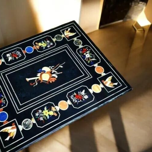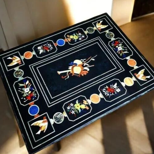 Specifications: Very unique Art by Indian Artist ,Coffee/Side Table top Used Material: Marble & Multi Semi Precious Gemstones Inlaid Size: 36"x24" Inches Color: Black Shape: Rectangle Pattern: Handmade Packaging: Wood & Foam Export Packing Shipping: Air Marble Inlay Table Tops We are the Manufacturer of Marble inlay furniture,Pietradura Coffee Table,vase,chessboard,boxes,photo frames,patio,Foyer,dining tables,Bathroom tiles,Back splash,Floor medallions & lots of exclusive handmade home decorative,Garden decor & collectible items For interior designers& Architects.This Beautiful art is a dying in Agra,India & We are trying our best to keep this beautiful art alive. They can also be placed outdoors in the garden, as marble is stain free, offers great resistance to the forces of nature, and can withstand heavy temperatures. We also meet customized requirement and offer our marble table tops at industry leading prices. Process of Making Marble Inlay We are inlaying semiprecious stones in three different colors of marble White Marble,Black Marble & green marble. The Marble used to inlay the semiprecious stone comes from city of Makrana, Rajasthan India. First we cut the marble in different shape example Round,Octagonal,rectangle,oval & square shape. After cutting the marble we paint the surface of marble with Hina(red Color) so we can sketch the geometry on the surface of Marble. With the Help Of emery wheel we cut,polish & shape the semiprecious in different forms of flowers,buds,leafs & stems all the cutting of the semiprecious stones are manually cut by the artisans. After cutting the semiprecious stones we assemble them to complete the motif & then the semiprecious stones are placed on the surface of marble so we can trace them on the surface of marble to make the exact size of the cavities once the stones are traced we remove the stones from the surface of marble & then manually we chisels the marble with the diamond chisels & tungsten carbide chisels once the cavities are completed we place the semiprecious stone in the cavities to check the depth of the stones. When we are fully sure that the stone fits well in the cavities we use special kind glue to fix the semiprecious stones into the marble. After completing the inlays into the marble we first rub the surface of marble with sandstone & then we polish the surface of marble with sandpaper which brings the natural shine on the surface of marble & to the semiprecious stone & we use wax polish to make the surface shiny. Most interesting expect of this pietre dure( marble inlay with hard stone) all the designs are made by the artisans are purely an imagination of artist once made they cannot make another one exactly the same it will look similar but will not be the same. This beautiful art is a dying art of Agra,India the artisans those make this beautiful art are the descendants of those families who built the Tajmahal in 17 century Tajmahal is a monument of love & you can easily see the artwork done with the same technique on the walls of the Tajmahal. I Invite you to come to Agra,India & visit the beautiful Tajmahal & you will surely be impressed & we request you give us a chance to show you the true handmade art of Agra by our artisans. When you are purchasing this beautiful handmade Marble inlay art you will always be happy because all the pcs made by our artisans with love,hope & happiness. You will always be enjoying the beautiful handmade marble inlay artwork secondly you will be supporting the local artisans of Agra,India to keep this beautiful dying art Alive. All the purchase benefits the artisans & the buyer as there is no middle men in selling & buying. USE OF THE PRODUCT It is beautiful for Home & garden decorative handmade Inlay Art add Royal Ambiance to your Home. You can use this as a Dining/Coffee Table, Side Table, End Table, Corner Table & Hotel, villa, home use, hall Flooring / Walling, corridors, vestibules of apartment or villas in the external & interior decorations. Note If You Are Looking Something Customize, Let Us Know We Will Make For You As Per Your Design, Size & Shape.This is only Table Top & Base/Leg is not included. You have to pay Spare money for Base. if you want We will get customize size Wooden & Marble Base made as per Client requirement. Shipping & Packaging For shipping we use DHL & FedEx Export packing sealed wooden, crate with foam plastic straps outside. If there is any Local Tax, Custom Duties or Vat at the destination, it will be paid by the buyer Inspiration/Story Behind This Product This beautiful art is a dying art of Agra,India the artisans those make this beautiful art are the descendants of those families who built the Tajmahal in 17 century Tajmahal is a monument of love & and one of the seven wonders in the world you can easily see the artwork done with the same technique on the walls of the Tajmahal. Wish you a very happy day & Happy shopping