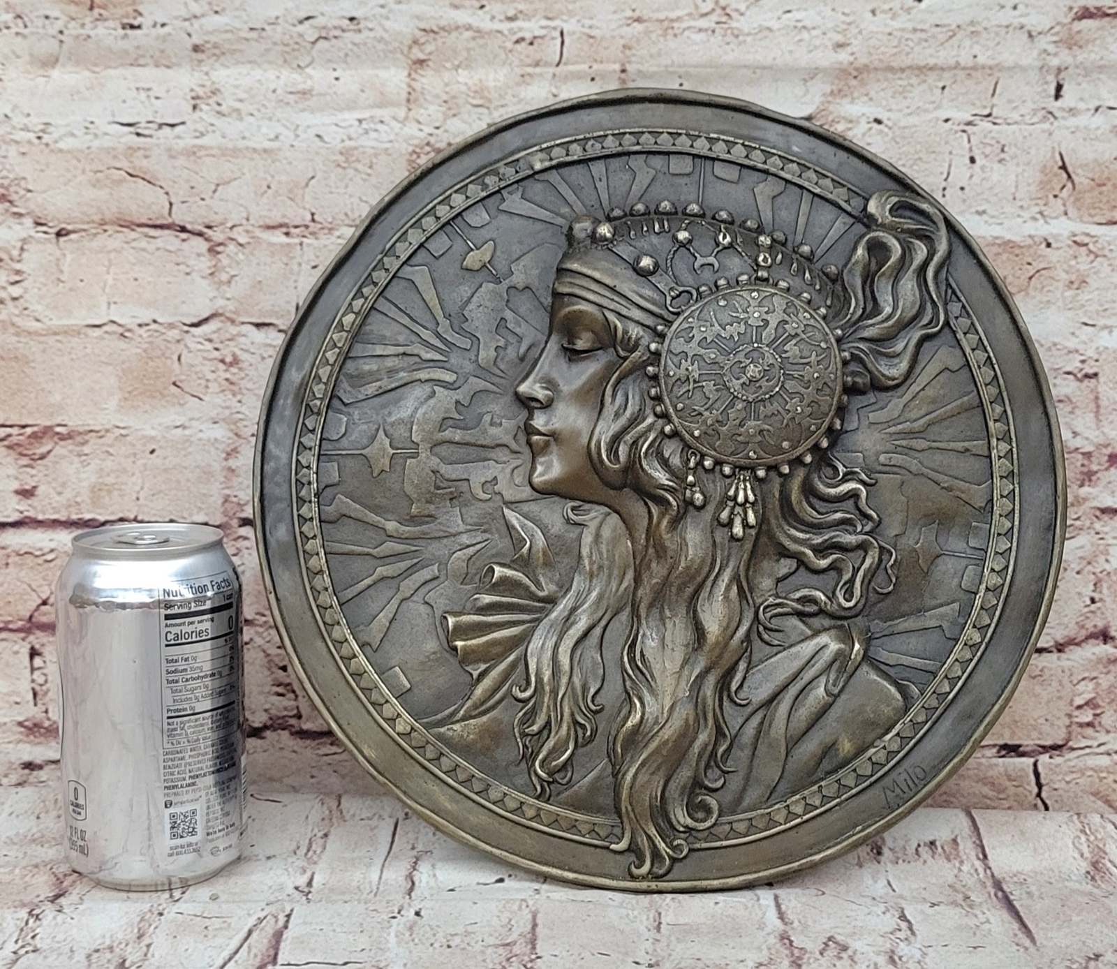 Condition : This sculpture is in perfect condition. Bronze Dimensions: Height 12" X Width 12"nbsp; nbsp; Weight:7 LBSnbsp;nbsp; Inventory:48Y10094384 Introducing a stunning bronze medallion wall piece showcasing the profile of a captivating woman. Her flowing hair gracefully cascades past her shoulders, while a simple headpiece adorns her elegant silhouette. With a diameter of approximately 12 inches, this artwork strikes the perfect balance between being a captivating focal point and a valuable addition to any collection of wall sculptures. Crafted using the esteemed lost wax method, this sculpture bears the signature of the renowned artist, Milo. Immerse yourself in the allure of this exquisite bronze medallion. The delicate features of the woman's profile and the intricate detailing bring a sense of beauty and elegance to any space. Whether it takes center stage as a focal point or complements an existing collection, this piece captures attention and sparks admiration with its refined craftsmanship. Experience the mastery of Milo's artistry through this exceptional bronze sculpture. The lost wax method ensures the utmost precision and quality, while the artist's signature guarantees authenticity. Don't miss the opportunity to own a true masterpiece that effortlessly blends artistry and aesthetic appeal, infusing your surroundings with timeless beauty and sophistication. Fine Rare French Bronze Statue Bas Relief Sculpture Figure Figurine Art Nouveau Video will open in a new window Using the eBay App? Paste link into a browser window: [isdntekvideo]
