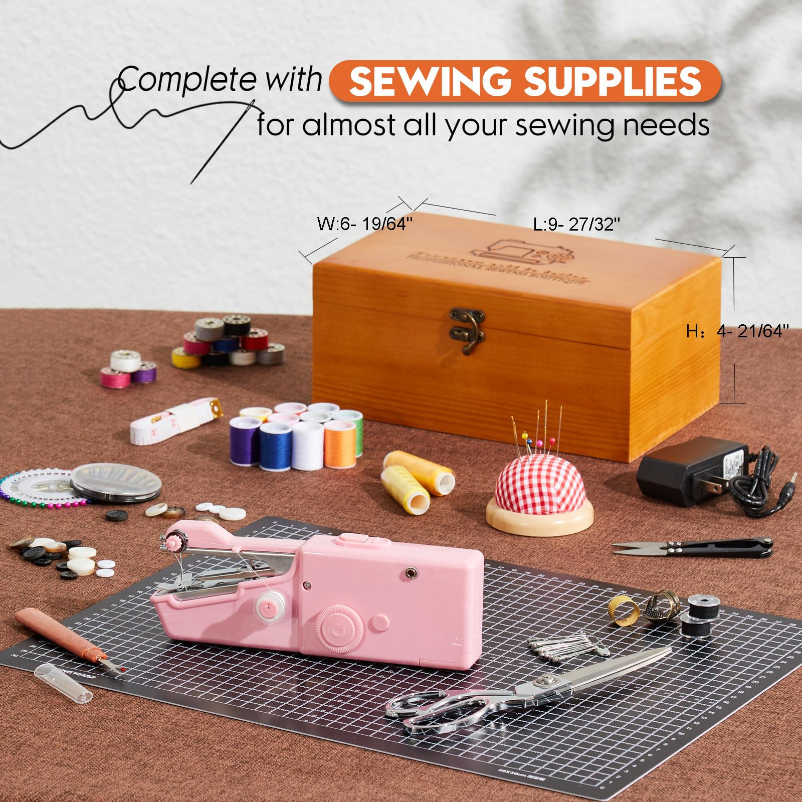【Package List】A total of 153 sewing accessories: 1 wooden storage box, 1 handheld sewing machine, 1 power adapter, 1 fabric scissors, 1 yarn thread cutter, 1 sewing seam rippers, 1 pin cushion, 22 rolls of polyester sewing threads, 12 metal bobbins and sewing threads, 40 straight pins sewing, 30 assorted hand sewing needles, 26 buttons, 10 safety pins, 2 sewing thimbles, 2 needle threaders, 1 soft tape measure, 1 spare Needle. 【Wide Range of Uses】 Suitable for various fabrics, such as: silk, fabric, denim, cotton and linen, can be used to repair patches, sewing clothes, aprons, baby bibs, pet clothes, plush toys, jeans, bed sheets, tablecloths, shopping bags, DIY crafts, etc., but please note that the thickness of the fabric can not exceed 5/64 inch. 【Portable】 This is a mini portable handheld sewing machine, equipped with 153 pcs of the most complete sewing kit, can meet almost all your sewing needs, is a home travel emergency essential stitch box, but also can be put in the car for backup. 【Power Supply Mode】Support a variety of power supply modes. 1. power adapter (included). 2. battery (requires 4 connection AA batteries, not included). 【Ideal Gift】Upgraded with new technology, increased power, reduced noise, easy to operate, not easy to skip stitches. Suitable for adults, kids, beginners, professionals. Is a good gift for mom, exquisite and practical. Is a good gift for children, exercise hands-on skills and enhance the ability to create DIY.