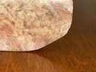 This 3.1/2“ high x 3 1/8“ wide stone statue features a Buddha figure, reflecting elements of Hinduism and Buddhism in its design. Tan, Olive, Brown colored stone most likely Soapstone. Excellent condition with one small chip underside on the meeting surface (in last picture). Some fine detail!